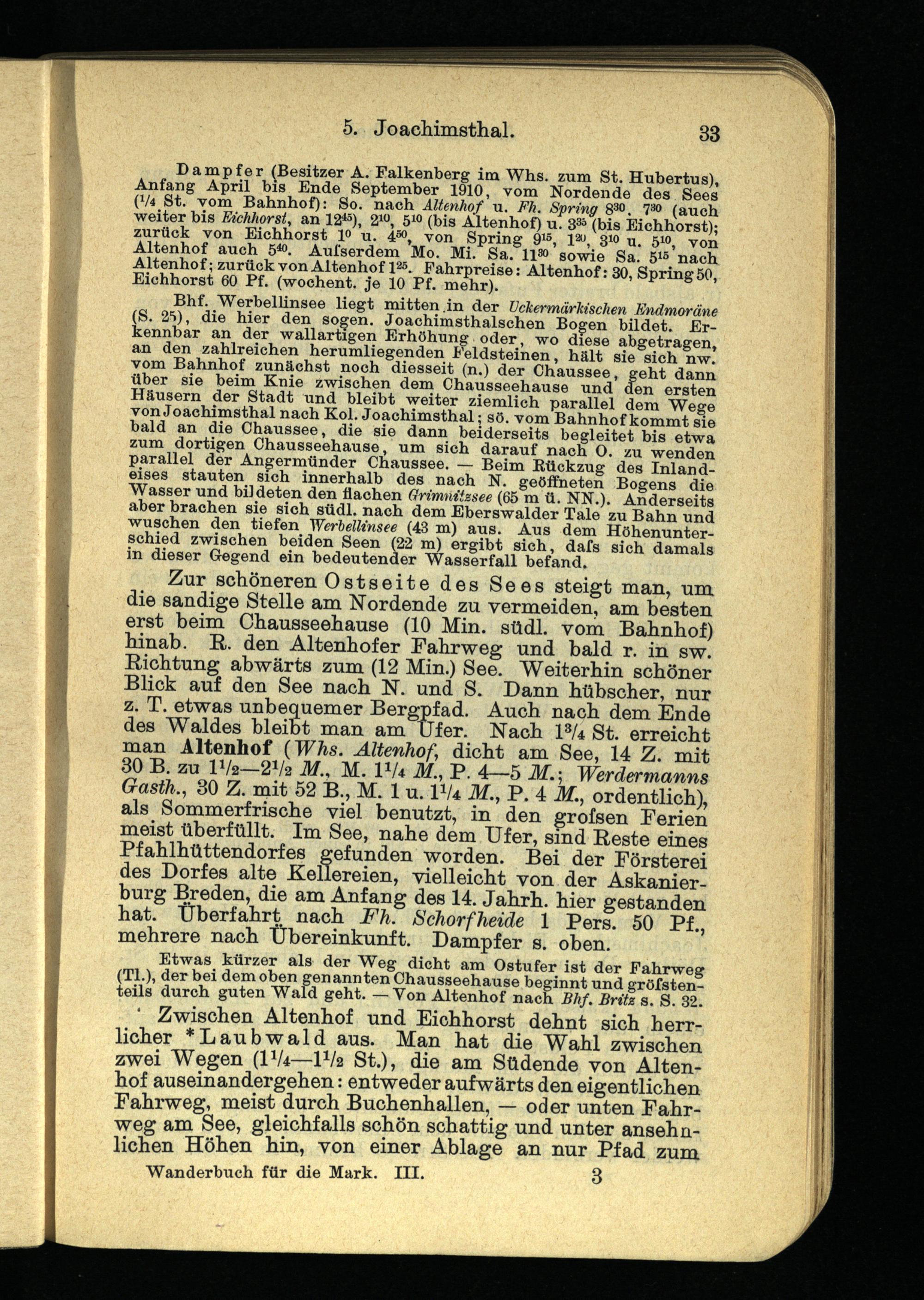 ' Zwischen Altenhof und Eichhorst dehnt sich herrlicher *Laubwald aus. Man hat die Wahl zwischen zwei Wegen (VU —IV 2 St.), die am Südende von Altenhof auseinandergehen: entweder aufwärts den eigentlichen Fahrweg, meist durch Buchenhallen, — oder unten Fahrweg am See, gleichfalls schön schattig und unter ansehnlichen Höhen hin, von einer Ablage an nur Pfad zum Wanderbuch für die Mark. III. 3
