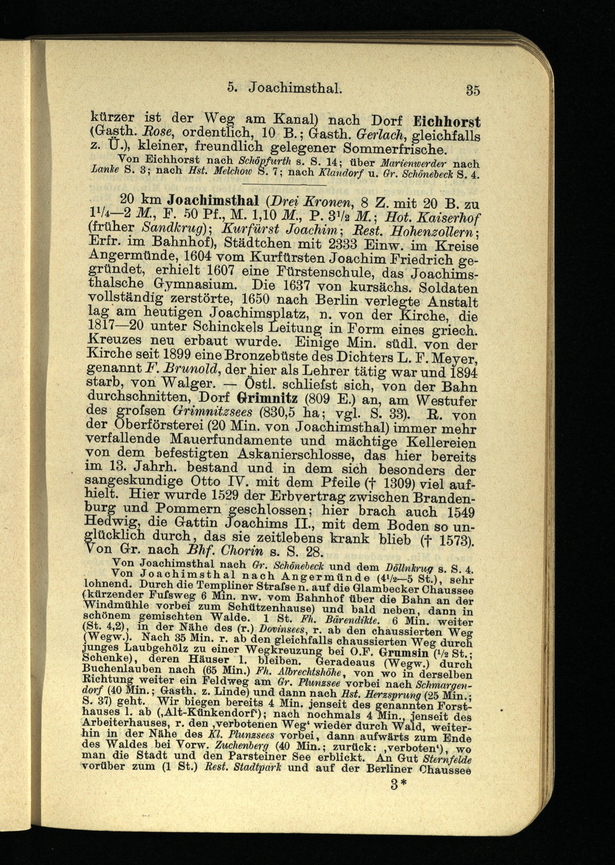 20 km Joachimsthal (Brei Kronen, 8 Z. mit 20 B. zu 1V4—2 M., F. 50 Pf., M. 1,10 M., P. 8Vs M.; Hot. Kaiserhof (früher Sandkrug)-, Kurfürst Joachim-, Best. Hohem ollem; Erfr. im Bahnhof), Städtchen mit 2333 Einw. im Kreise Angermtinde, 1604 vom Kurfürsten Joachim Friedrich gegründet, erhielt 1607 eine Fürstenschule, das Joachims- thalsche Gymnasium. Die 1637 von kursächs. Soldaten vollständig zerstörte, 1650 nach Berlin verlegte Anstalt lag am heutigen Joachimsplatz, n. von der Kirche, die 1817—20 unter Schinckels Leitung in Form eines griech. Kreuzes neu erbaut wurde. Einige Min. stidl. von der Kirche seit 1899 eine Bronzebüste des Dichters L. F. Meyer, genannt F. Brunold, der hier als Lehrer tätig war und 1894 starb, von Walger. — Östl. schliefst sich, von der Bahn durchschnitten, Dorf Grimnitz (809 E.) an, am Westufer des grofsen Grimnitz sees (830,5 ha; vgl. S. 33). K. von der Oberförsterei (20 Min. von Joachimsthal) immer mehr verfallende Mauerfundamente und mächtige Kellereien von dem befestigten Askanierschlosse, das hier bereits im 13. Jahrh. bestand und in dem sich besonders der sangeskundige Otto IV. mit dem Pfeile (f 1309) viel aufhielt. Hier wurde 1529 der Erbvertrag zwischen Brandenburg und Pommern geschlossen; hier brach auch 1549 Hedwig, die Gattin Joachims II., mit dem Boden so unglücklich durch, das sie zeitlebens krank blieb (f 1573). Von Gr. nach Bhf. Chorin s. S. 28.