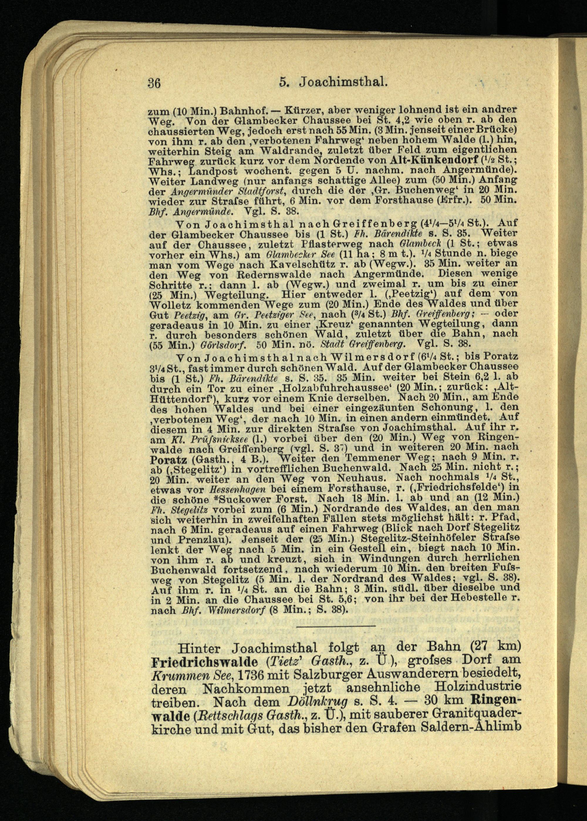 Hinter Joachimsthal folgt an der Bahn (27 km) Friedrichswalde ('J'ietz' Gasth., z. Ü), grofses Dorf am Krummen See, 1736 mit Salzburger Auswanderern besiedelt, deren Nachkommen jetzt ansehnliche Holzindustrie treiben. Nach dem Döllnkrug s. S. 4. — 30 km Bingenwalde (Bettschlags Gasth., z. Ü.), mit sauberer Granitquaderkirche und mit Gut, das bisher den Grafen Saldern-Ählimb