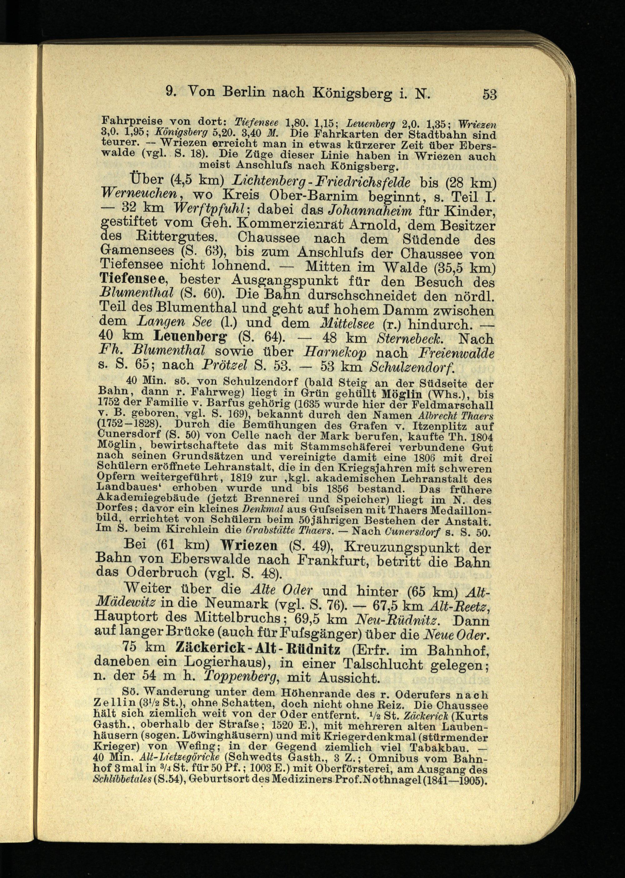 Fahrpreise von dort: Tüfensee 1,80. 1,15; Leuenberg 2,0. 1,85; Wriezen 3,0. 1,95; Königsberg 5,20. 3,40 M. Die Fahrkarten der Stadtbahn sind teurer. -- Wriezen erreicht man in etwas kürzerer Zeit über Eberswalde (vgl. S. 18). Die Züge dieser Linie haben in Wriezen auch meist Anschlufs nach Königsberg.