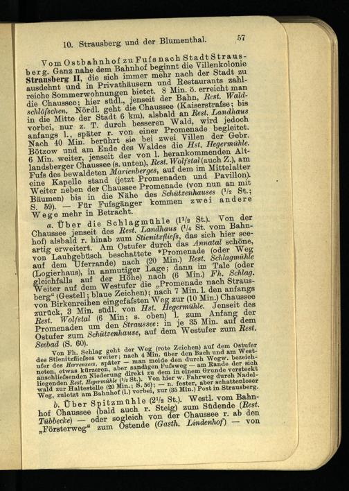 a. Über die Schlagmühle (IVa St.). Von der Chaussee jenseit des Rest. Landhaus (V* St. vom Bahnhof) alsbald r. hinab zum Stienitzfließ, das sich hier seeartig erweitert. Am Ostufer durch das Annatal schöne, von Laubgebüsch beschattete *Promenade (oder Weg auf dem Uferrande) nach (20 Min.) Rest. Schlagmühle (Logierhaus), in anmutiger Lage; dann im Tale (oder gleichfalls auf der Höhe) nach (6 Min.) Fh. Schlag. Weiter auf dem Westufer die „Promenade nach Strausberg“ (Gestell; blaue Zeichen); nach 7 Min. 1. den anfangs von Birkenreihen eingefafsten Weg zur (10 Min.) Chaussee zurück, 8 Min. südl. von Hst. Hegermühle. Jenseit des Rest. Wolfstal (6 Min; s. oben) 1. zum Anfang der Promenaden um den Straussee: in je 85 Min. auf dem Ostufer zum Schützenhause, auf dem Westufer zum Rest. Seebad (S. 60).