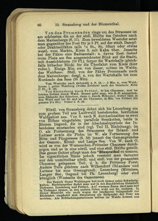 Nördl. von Strausberg dehnt sich bis Leuenberg ein zum grofsen Teil aus Laubwald bestehendes, herrliches Waldgebiet aus. Von S. nach N. durchschneiden es zwei von Höhen eingefafste; parallele Seenketten, beide in Rinnen liegend, die in der Abschmelzperiode des Inlandeises entstanden sind (vgl. Teil II. Einleitung); im O. als Fortsetzung des Straussees der Ihland- und Lattsee sowie die Piche, im W. als Fortsetzung des Bötz- und Fängersees (S. 58) jenseit des Gramengrundes der Garnen-, Mittel- und Lange See. Von W. nach O. wird es von der Werneuchen-Prötzeler Chaussee durchzogen und so in eine nördl. und eine südl. Hälfte geteilt. Das ganze Gebiet pflegt man den *Blnmenthal zu nennen. Im eigentlichen Sinne jedoch versteht man darunter nur den unmittelbar nördl. und südl. von der genannten Chaussee gelegenen Teil, d. h. die Prötzeler Forst. Andere Teüe gehören nach Wilkendorf (Ihlandsee und Lattsee bis zum Grenzgrund), Leuenberg (Mittelsee, Langer See, Gegend bei Ph. Leuenberg) oder sind königlich (Westseite des Gamensees).