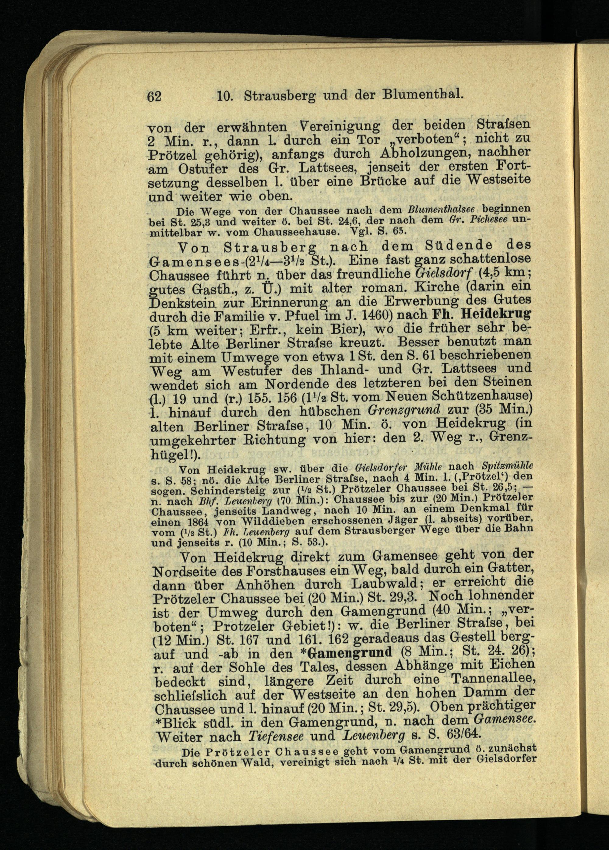 Von Heidekrug direkt zum Gamensee geht von der Nordseite des Forsthauses ein Weg, bald durch ein Gatter, dann über Anhöhen durch Laubwald; er erreicht die Prötzeler Chaussee bei (20 Min.) St. 29,3. Noch lohnender ist der Umweg durch den Gamengrund (40 Min.; „verboten“ ; Prötzeler Gebiet!): w. die Berliner Strafse, bei (12 Min.) St. 167 und 161. 162 geradeaus das Gestell bergauf und -ab in den *Gamengrund (8 Min.; St. 24. 26); r. auf der Sohle des Tales, dessen Abhänge mit Eichen bedeckt sind, längere Zeit durch eine Tannenallee, schliefslich auf der VVestseite an den hohen Damm der Chaussee und 1. hinauf (20 Min.; St. 29,5). Oben prächtiger *Blick südl. in den Gamengrund, n. nach dem Gamensee. Weiter nach Tiefensee und Leuenberg s. S. 63/64.
