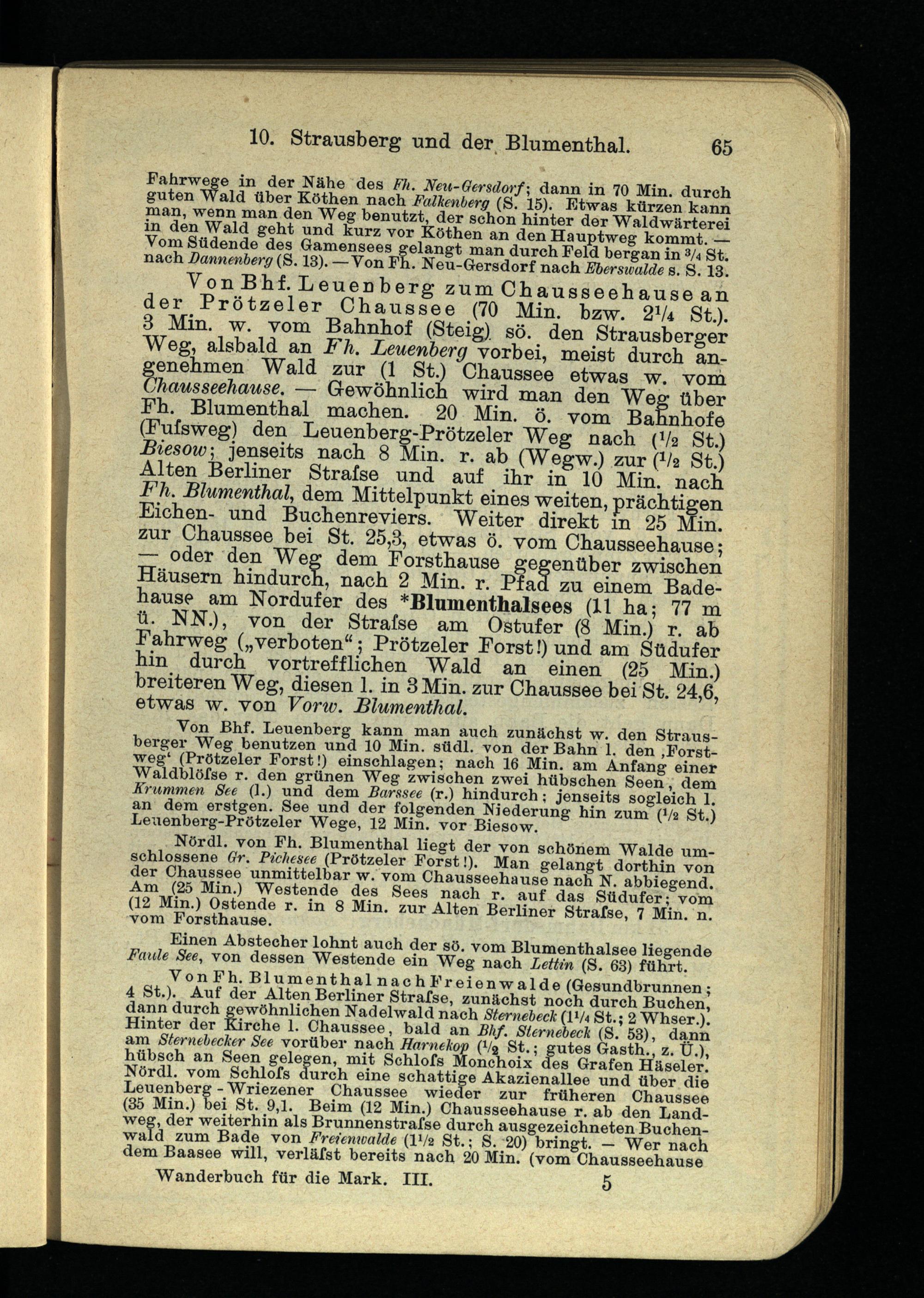 3 Min. w. vom Bahnhof (Steig), sö. den Strausberger Weg, alsbald an Fh. Leuenherg vorbei, meist durch angenehmen Wald zur (1 St.) Chaussee etwas w. vom Chausseehause. — Gewöhnlich wird man den Weg über Fh. Blumenthal machen. 20 Min. ö. vom Bahnhofe (Fufsweg) den Leuenberg-Prötzeler Weg nach (bä St.) Biesow, jenseits nach 8 Min. r. ab (Wegw.) zur (ba St.) Alten Berliner Strafse und auf ihr in 10 Min. nach Fh. Blumenthal, dem Mittelpunkt eines weiten, prächtigen Eichen- und Buchenreviers. Weiter direkt m 25 Min. zur Chaussee bei St. 25,3, etwas ö. vom Chausseehause; — oder den Weg dem Forsthause gegenüber zwischen Häusern hindurch, nach 2 Min. r. Pfad zu einem Badehause am Nordufer des *Blumentlialsees (11 ha; 77 m ü. NN.), von der Strafse am Ostufer (8 Min.) r. ab Fahrweg („verboten“; Prötzeler Forst!) und am Südufer hin durch vortrefflichen Wald an einen (25 Min.) breiteren Weg, diesen 1. in 3 Min. zur Chaussee bei St. 24,6, etwas w. von Vonv. Blumenthal.