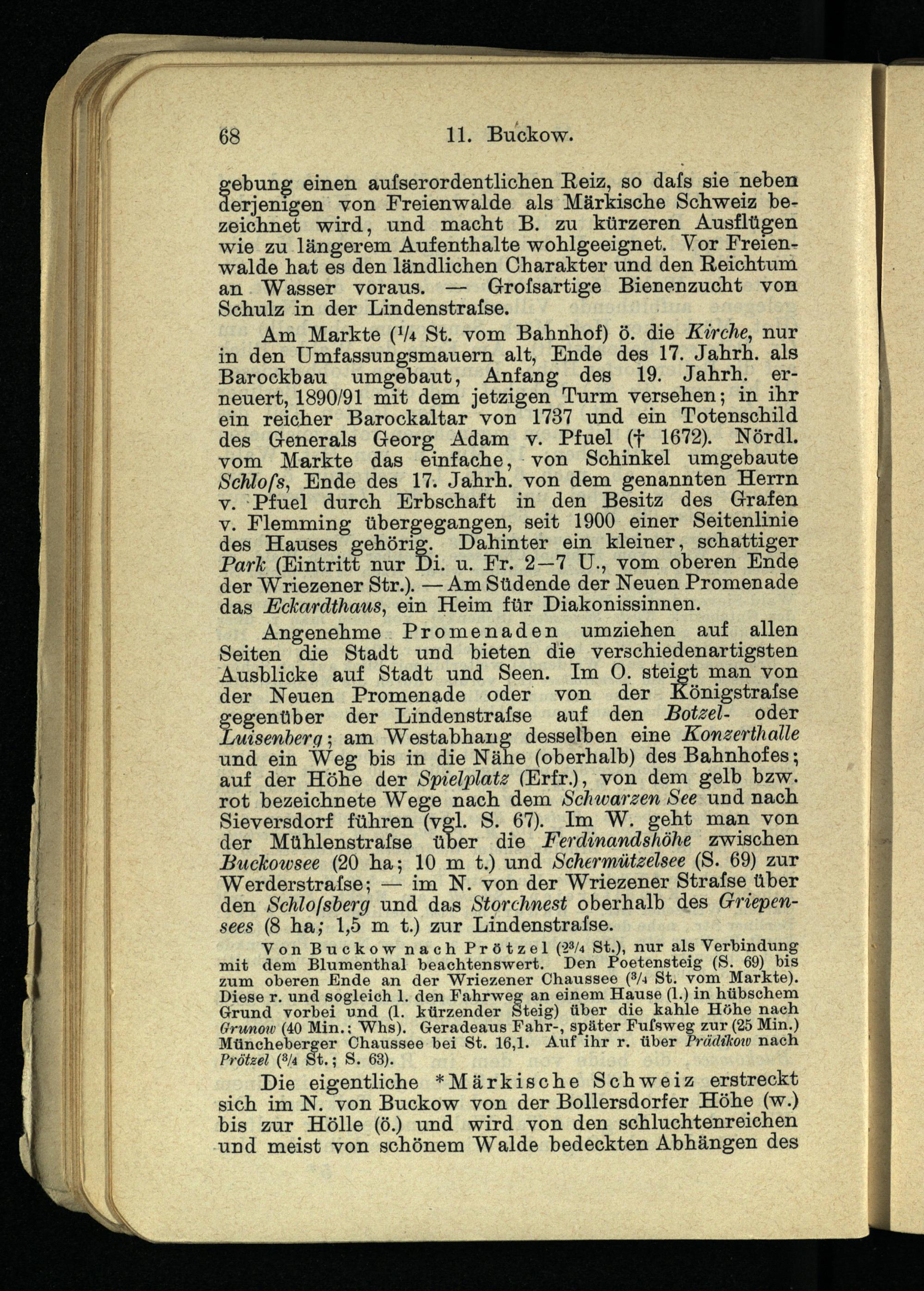 Die eigentliche *Märkische Schweiz erstreckt sich im N. von Buckow von der Bollersdorfer Höhe (w.) bis zur Hölle (ö.) und wird von den schluchtenreichen und meist von schönem Walde bedeckten Abhängen des