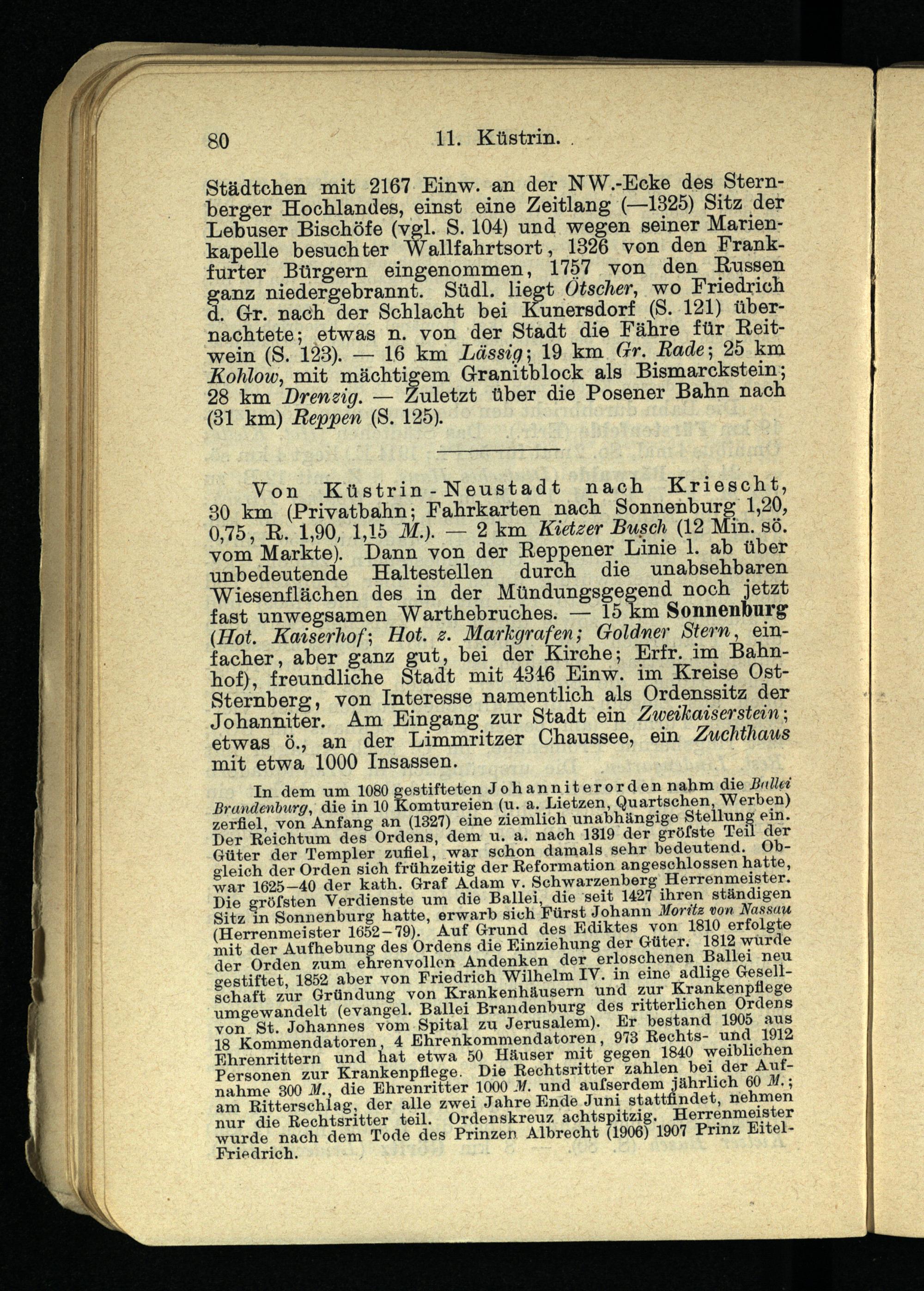 Von Küstrin - Neustadt nach Kriescht, 30 km (Privatbahn; Fahrkarten nach Sonnenburg 1,20, 0,75, R. 1,90, 1,15 M.). — 2 km Kietz er Busch (12 Min. sö. vom Markte). Dann von der Reppener Linie 1. ab über unbedeutende Haltestellen durch die unabsehbaren "Wiesenflächen des in der Mündungsgegend noch jetzt fast unwegsamen 'Warthebruches. — 15 km Sonnenburg {Hot. Kaiserhof-, Hot. z. Markgrafen; Goldner Stern, einfacher, aber ganz gut, bei der Kirche; Erfr. im Bahnhof), freundliche Stadt mit 4346 Einw. im Kreise Ost- Sternberg, von Interesse namentlich als Ordenssitz der Johanniter. Am Eingang zur Stadt ein Zweikaiserstein-, etwas Ö., an der Limmritzer Chaussee, ein Zuchthaus mit etwa 1000 Insassen.
