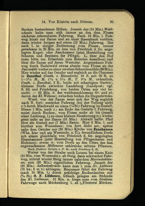 Buchen bestandenen Höhen. Jenseit der (10 Min.) Waldschenke halte man sich immer an den dem Flusse nächsten erkennbaren Fahrweg. Hach 18 Min. 1. Fufs- weg hinab zur Zanze und an einer Basenbank vorüber, dann wieder bergan auf einen (12 Min.) Fahrweg. Ihn nach 1. in einiger Entfernung vom Flusse, immer geradeaus in 25 Min. zu dem von Friedrich d. Gr. angelegten Kugel- oder Zanzhammer (jetzt Herstellung von Scharen und Brettern für Pflüge). L. über den Hof (man bitte um Erlaubnis zum Betreten desselben) und über die Zanze auf deren Westufer. Angenehmer Fufs- weg durch Nadelwald etwas abseits vom Flusse an der Zanzmühle vorbei zu einer zweiten Schneidemühle (20 Min.). Hier wieder auf das Ostufer und sogleich an die Chaussee in Zanzthal ( Gasth. z. Biesenkrebs, 10 Z. mit 20 B. zu 1 — l J /a M., M. VU u. P/a M., P. 3'/a M., ordentlich, Gasth. z. Zanzthal, 2 B., beide mit schattigem Garten), kleinem Dorfe zwischen Landsberg (Landpost; vgl. S. 92) und Friedeberg, von beiden Orten aus viel besucht. — 25 Min. ö. der waldumschlossene Gr. und so. davon der Kl. Welmsee ; zwischen beiden die Ziegenbrücke.