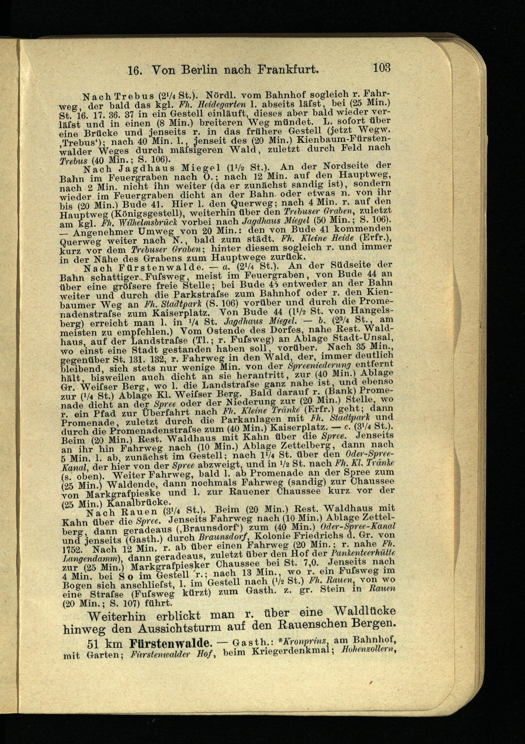 Nach Fürstenwalde. — a. (2V4 St.). An der Südseite der Bahn schattiger Fufsweg, meist im Feuergraben, von Bude 44 an Über eine gröfsere freie Stelle; bei Bude 45 entweder an der Bahn weiter und durch die Parkstrafse zum Bahnhof oder r. den Kien- baumer Weg an Fh. Stadtpark (S. 106) vorüber und durch die Prome- nadenstrafse zum Kaiserplatz. Von Bude 44 (IV2 St. von Hangeisberg) erreicht man 1. in V4 St. Jagdhaus Miegel. — 6. (2 3 /4 St., am meisten zu empfehlen.) Vom Ostende des Dorfes, nahe Rest. Waldhaus, auf der Landstrafse (TI.; r. Fufsweg) an Ablage Stadt-Unsal, wo einst eine Stadt gestanden haben soll, vorüber. Nach 35 Min., gegenüber St. 131. 132, r. Fahrweg in den Wald, der, immer deutlich bleibend, sich stets nur wenige Min. von der Spreeniederung entfernt hält, bisweilen auch dicht an sie herantritt, zur (40 Min.) Ablage Gr. Weifser Berg, wo 1. die Landstrafse ganz nahe ist, und ebenso zur (V4 St.) Ablage Kl. Weifser Berg. Bald darauf r. (Bank) Promenade dicht an der Spree oder der Niederung zur (20 Min.) Stelle, wo r. ein Pfad zur Überfahrt nach Fh. Kleine Tränke (Erfr.) geht; dann Promenade, zuletzt durch die Parkanlagen mit Fh. Stadtpark und durch die Promenadenstrafse zum (40 Min.) Kaiserplatz. — c. (3 l /4 St.). Beim (20 Min.) Rest. Waldhaus mit Kahn über die Spree. Jenseits an ihr hin Fahrweg nach (10 Min.) Ablage Zettelberg, dann nach 5 Min. 1. ab, zunächst im Gestell; nach IV* St. über den Oder-Spree- Kanal, der hier von der Spree abzweigt, und in Va St. nach Fh. Kl. Tränke (s. oben). Weiter Fahrweg, bald 1. ab Promenade an der Spree zum (25 Min.) Waldende, dann nochmals Fahrweg (sandig) zur Chaussee von Markgrafpieske und 1. zur Rauener Chaussee kurz vor der (25 Min.) Kanalbrücke.