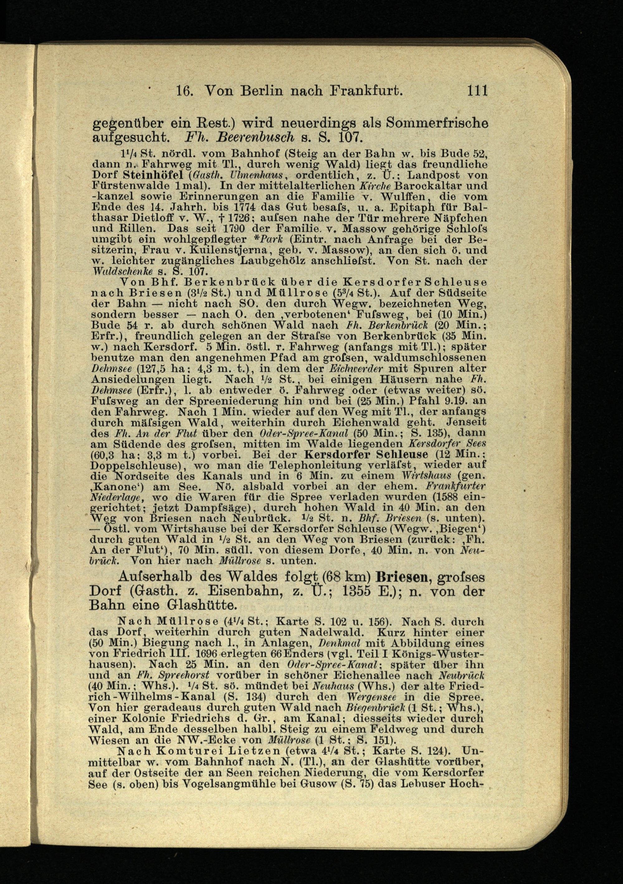 Von Bhf. Berkenbrück über die KersdorferSchleuse nach Briesen (8V2 St.) und Müllrose (5 3 /4 St.). Auf der Südseite der Bahn — nicht nach SO. den durch Wegw. bezeichneten Weg, sondern besser — nach 0. den verbotenen* Fufsweg, bei (10 Min.) Bude 54 r. ab durch schönen Wald nach fh. Berkenbrück (20 Min.; Erfr.), freundlich gelegen an der Strafse von Berkenbrück (35 Min. w.) nach Kersdorf. 5 Min. östl. r. Fahrweg (anfangs mit TI.); später benutze man den angenehmen Pfad am grofsen, waldumschlossenen Dehmsee (127,5 ha: 4,3 m. t.), in dem der Eichicerder mit Spuren alter Ansiedelungen liegt. Nach V2 St., bei einigen Häusern nahe Fh. Dehmsee (Erfr.), 1. ab entweder ö. Fahrweg oder (etwas weiter) sö. Fufsweg an der Spreeniederung hin und bei (25 Min.) Pfahl 9.19. an den Fahrweg. Nach 1 Min. wieder auf den Weg mit TL, der anfangs durch mäfsigen Wald, weiterhin durch Eichenwald geht. Jenseit des Fh. An der Flut über den Oder-Spree-Kanal (50 Min.; S. 135), dann am Südende des grofsen, mitten im Walde liegenden Kersdorfer Sees (60,3 ha; 3,3 m t.) vorbei. Bei der Kersdorfer Schleuse (12 Min.; Doppelschleuse), wo man die Telephonleitung verläfst, wieder auf die Nordseite des Kanals und in 6 Min. zu einem Wirtshaus (gen.