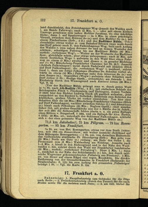 land durchbricht, den Petershagener Weg (jenseit des Waldes auch 1. am Rande Fahrweg); nach 55 Min. 1. — oder mit einem kleinen Umwege geradeaus züm nahen Madlitzer Forsihaus, wo eine mächtige Fiche, dann 1. auf Spazierwegen — in 5 Min. in einen prächtigen *Grund, zwischen dem Briesener See (s.) und dem Madlitzer See (n.), mit einem Fischerhause (Erfr., 2 Z.) und der Madlitzer Mühle. Oder ebendahin: etwas weiter w. vom Bahnhof Briesen (man mufs durch das Dorf gehen) nach N. den Falkenhagener Weg, bald nach Anfang des Waldes r. zum nahen Briesener See und an dessen Westufer den schönen, schattigen Fufsweg bis zur Madlitzer Mühle (80 Min.; zurück: ,verbotener Weg'). — "Weiter an der Westseite des Madlitzer Sees, gleichfalls schön, aber etwas unbequemer: nach 35 Min. mit einem deutlichen "Wege 1. aufwärts in den "Wald über einen Fahrweg zu einem (5 Min.) zweiten und diesen r. in gerader Richtung zur ( l /4 St.) Müncheberg-Frankfurter Chaussee bei St. 69,7. Jenseits (,Schlofs Falkenhagen 1 ) meist durch Nadelwald mit Akazien (Blick auf Dorf Falkenhagen), die verbotenen Wege 4 1. meidend, zuletzt 2mal 1,, dann am Schloss Falkenhagen (Besitzer Dr. Schultz) vorbei abwärts zu einem (50 Mm.) Fahrwege nahe dem Schwarzen See (s.) und dem Burgsee (n.). Gegenüber (Wegw.) aufwärts ohne Schatten nach Dorf Lützen (1 St.; Seeligs Gasth., ordentlich); am Ostende 1. den Kirchsteig durch den Wiesengrund nach K&mturei Lietzen (20 Min.). "Vgl. S. 52.