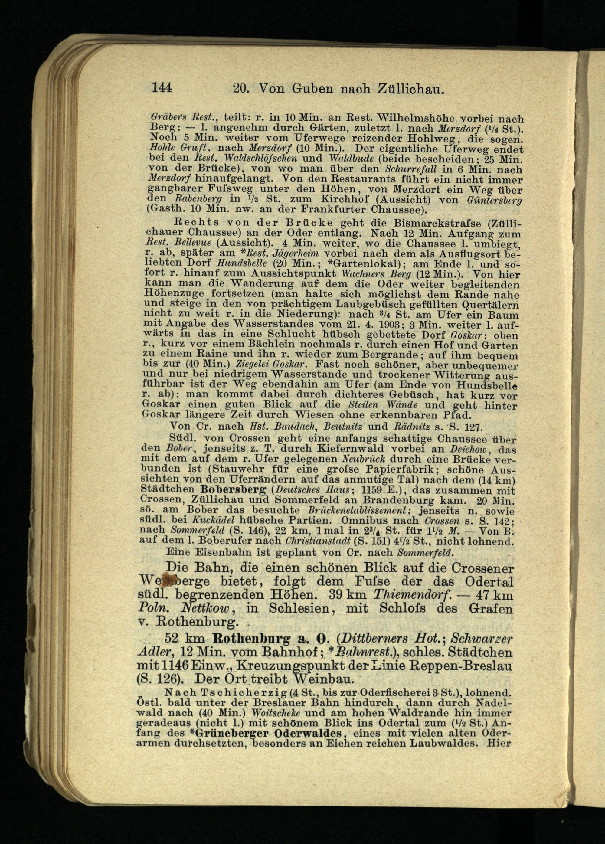 52 km Rothenburg a, O. ( Dittberners Hot.; Schwarzer Adler, 12 Min. vom Bahnhof; * Bahnrest.), schles. Städtchen mitll46Einw., Kreuzungspunkt der Linie Reppen-Breslau (S. 126). Der Ort treibt Weinbau.