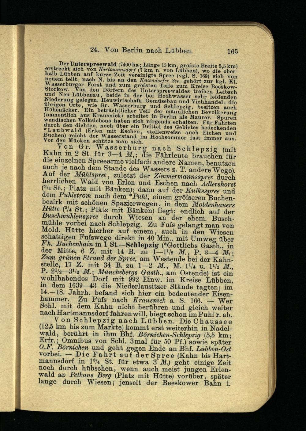 Von Schiepzig nach Lübben. Die Chaussee (12,5 km bis zum Markte) kommt erst weiterhin in Nadelwald, berührt in ihm Bhf. Börnichen-Schlepzig (5,5 km; Erfr.; Omnibus von Schl. 3mal für 50 Pf.) sowie später O.F. Börnichen und geht gegen Ende an Bhf. Lübben-Ost vorbei. — Die Fahrt auf der Spree (Kahn bis Hartmannsdorf in l 3 /4 St. für etwa 3 M.) geht einige Zeit noch durch hübschen, wenn auch meist jungen Erlenwald an Petkans Berg (Platz mit Hütte) vorüber, später lange durch Wiesen; jenseit der Beeskower Bahn 1.