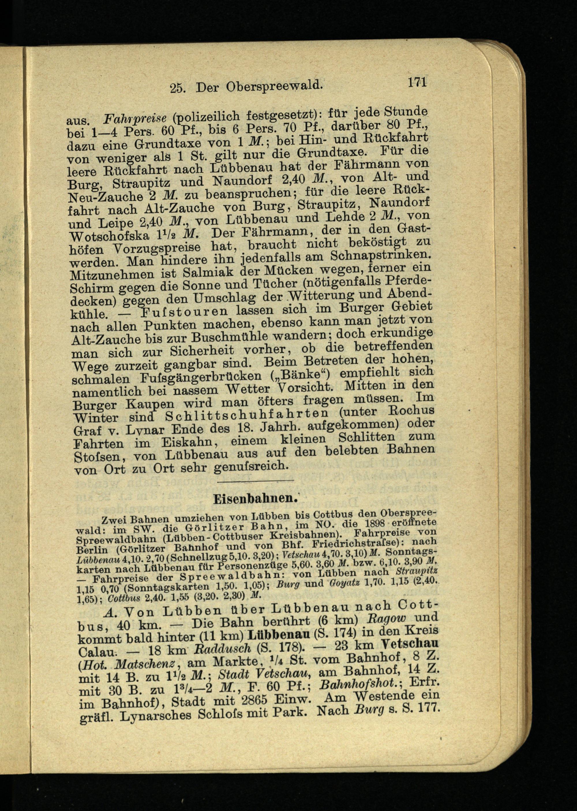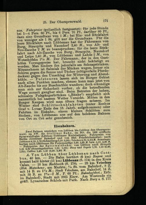 Zwei Bahnen umziehen von Ltibben bis Cottbus den Oberspreewald: im SW. die Görlitzer Bahn, im NO. die 1898 erönnete Spreewaldbahn (Lübben-Cottbuser Kreisbahnen). Fahrpreise von Berlin (Görlitzer Bahnhof und von Bhf. Friedrichstrafse): nach Lübbenau 4,10. 2,70 (Schnellzug5,10.3,20); Vetschau 4,10. 3,10) M. Sonntagskarten nach Lübbenau für Personenzüge 5,60. 3,60 M. bzw. 6,10. 3,90 M, — Fahrpreise der Spreewaldbahn: von Lübben nach Straupitz 1,15 0,70 (Sonntagskarten 1,50. 1,05); Burg und Ooyatz 1,70. 1,15 (2,40. 1,65); Cottbus 2,40. 1,55 (3,20. 2,30) M.