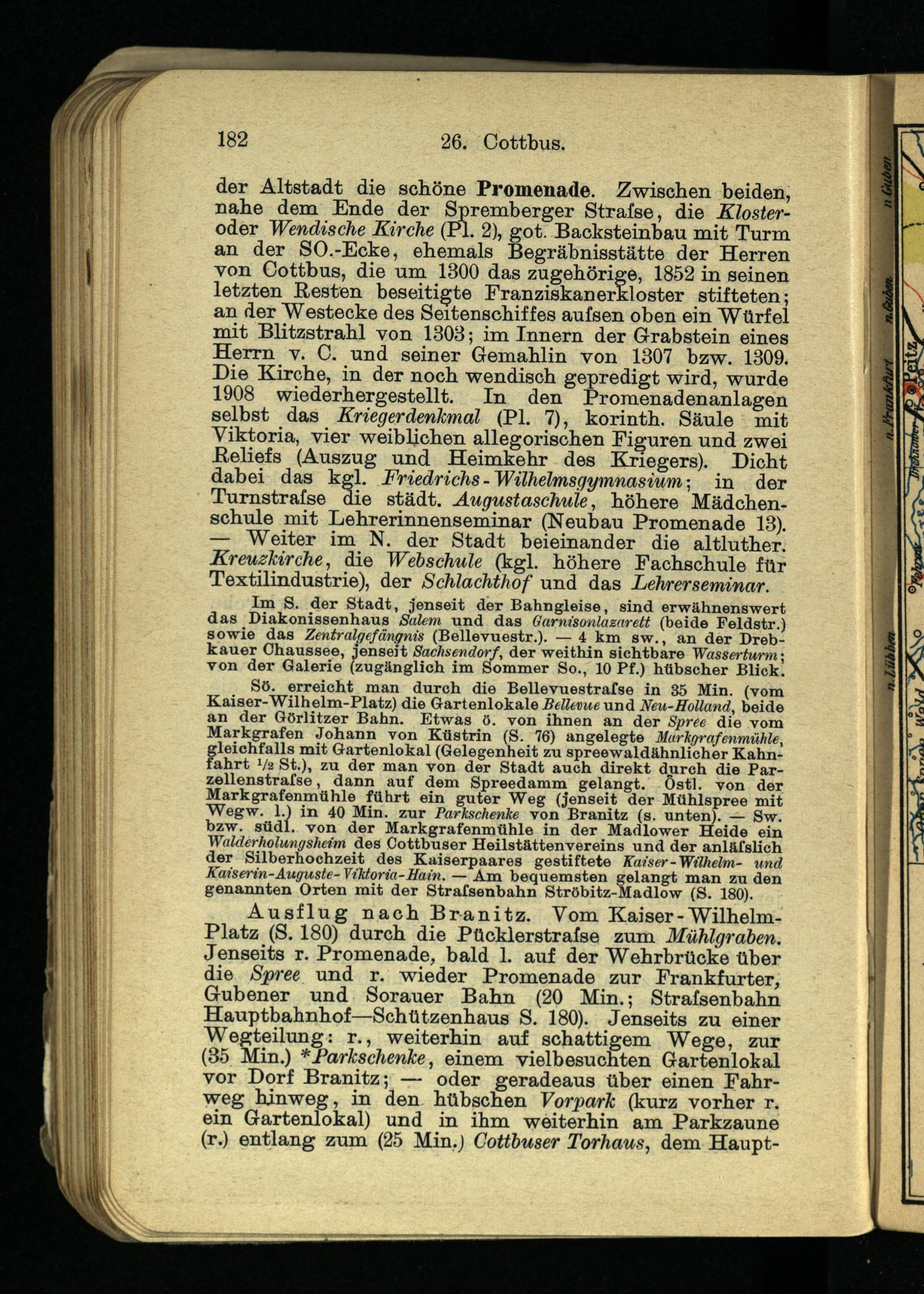 Sö. erreicht man durch die Bellevuestrafse in 35 Min. (vom Kaiser-Wilhelm-Platz) die Gartenlokale Bellevue und Neu-Holland , beide an der Görlitzer Bahn. Etwas ö. von ihnen an der Spree die vom Markgrafen Johann von Küstrin (S. 76) angelegte Markgrafenmühle , gleichfalls mit Gartenlokal (Gelegenheit zu spreewaldähnlicher Kahnfahrt Va St.), zu der man von der Stadt auch direkt durch die Par- zellenstrafse, dann auf dem Spreedamm gelangt. Östl. von der Markgrafenmühle führt ein guter Weg (jenseit der Mühlspree mit Wegw. 1.) in 40 Min. zur Parkschenke von Branitz (s. unten). — Sw. bzw. südl. von der Markgrafenmühle in der Madlower Heide ein Walderholungsheim des Cottbuser Heilstättenvereins und der anläfslich der Silberhochzeit des Kaiserpaares gestiftete Kaiser-Wilhelm- und Kaiserin-Auguste-Viktoria-Hain. — Am bequemsten gelangt man zu den genannten Orten mit der Strafsenbahn Ströbitz-Madlow (S. 180).
