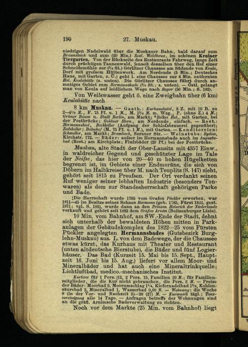 8 km Muskau. — G-asth.: Kurhaushotel, 8 Z. mit 20 B. zu 2—4Va M., F. 75 Pf. 11 , IM., M. ia/4 M. m. Wzg., P. (ohne Z.) 4 M.-, Grüner Baum u. Stadt Berlin, am Markt; *Rolkes Hot., mit Garten, bei der Postbrücke; Goldner Stern, am Nordende, einfach. — Best.: Hermannsbad, BocJcJceller (Aufgang der Schlofsbrauerei gegenüber); Ratskeller; Bahnhof (M. 75 Pf. u. 1 M.), mit Garten. — Konditoreien: Schmelter, am Markt; Brambach, Sorauer Str. — Weinstube: Sydow, Kirchstr. 172. — Bäder: aufser im Hermannsbade auch im Augusta- bad (Best.) am Kirchplatz; Flufsbäder (20 Pf.) bei der Postbrücke.