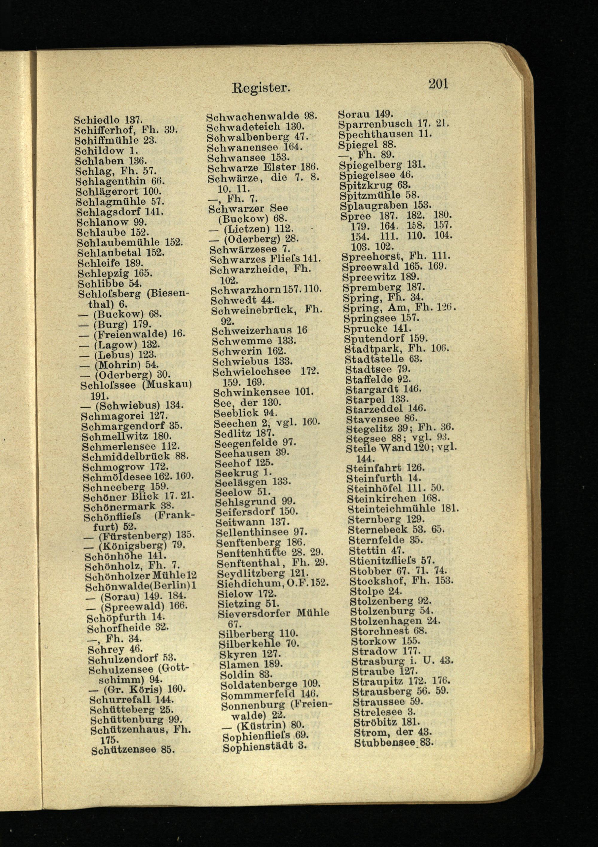 Spreehorst, Fh. 111. Spreewald 165. 169. Spreewitz 189. Spremberg 187. Spring, Fh. 34. Spring, Am, Fh. 126. Springsee 157. Spruche 141. Sputendorf 159. Stadtpark, Fh. 106. Stadtstelle 63. Stadtsee 79. Staffelde 92. Stargardt 146. Starpel 133. Starzeddel 146. Stavensee 86. Stegelitz 39; Fh. 36. Stegsee 88; vgl. 93. Steile Wand 120; vgl. 144.