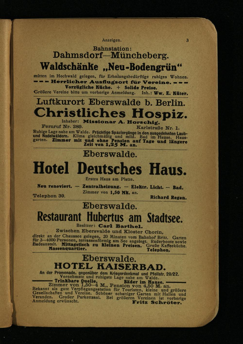 Zwischen Eberswalde und Kloster Chorin, direkt an der Chaussee gelegen, 20 Minuten vom Bahnhof Britz. Garten für 3—4000 Personen, terrassenförmig am See angelegt. Ruderboote sowie Badeanstalt. Mittagctisch zu Kiemen Preisen. Große Kaffeeküche. Haisenauartier. Telephon.