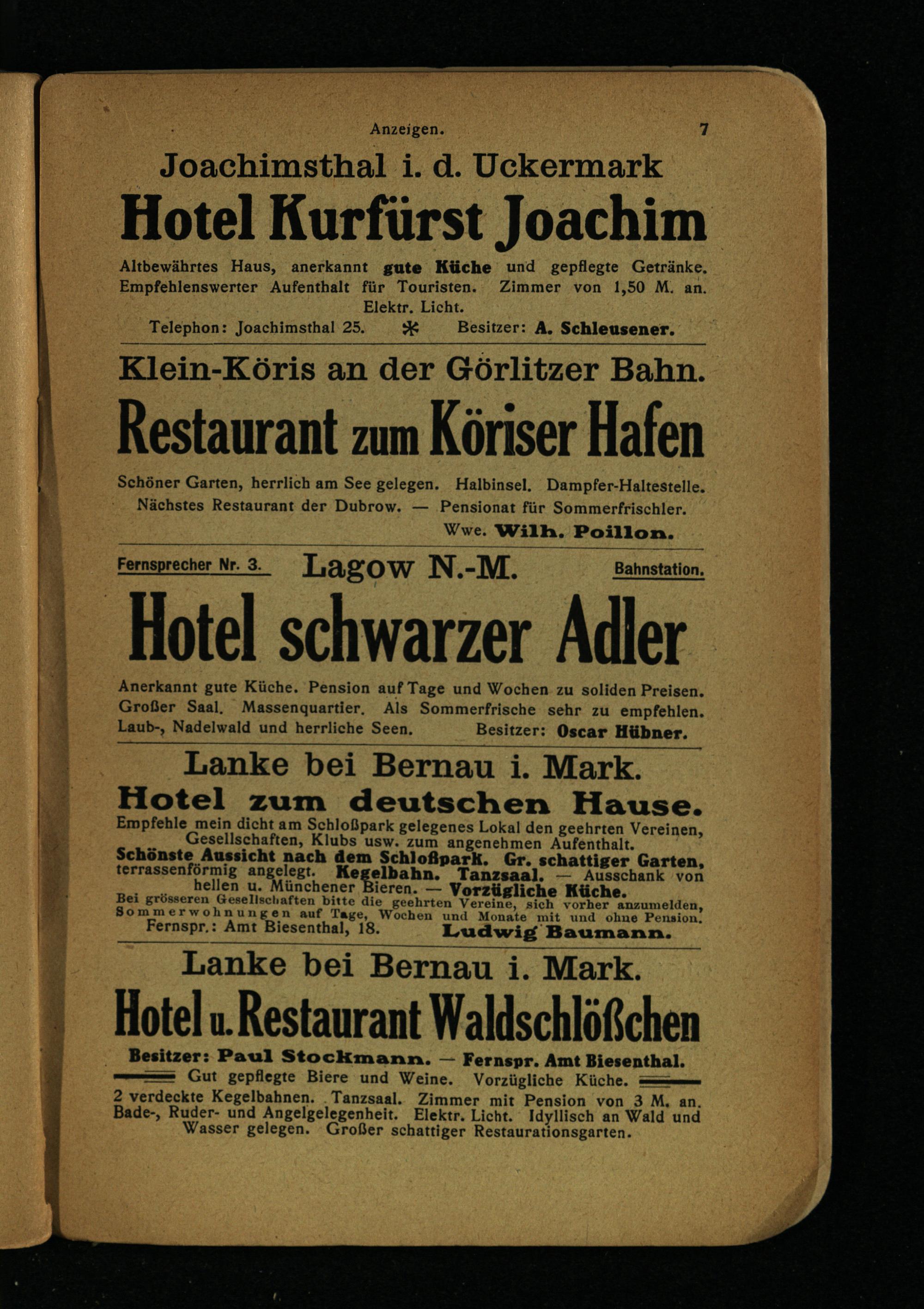 Telephon: Joachimsthal 25. #5 Besitzer: A. Schleusener.