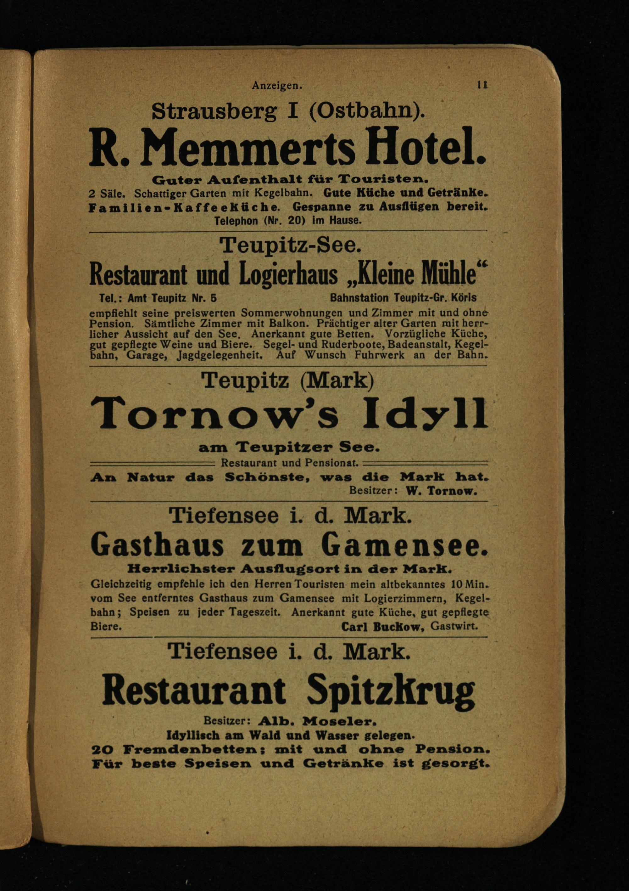 Gleichzeitig empfehle ich den Herren Touristen mein altbekanntes 10 Min. vom See entferntes Gasthaus zum Gamensee mit Logierzimmern» Kegelbahn ; Speisen zu jeder Tageszeit. Anerkannt gute Küche» gut gepflegte Biere. Carl Buckow» Gastwirt.