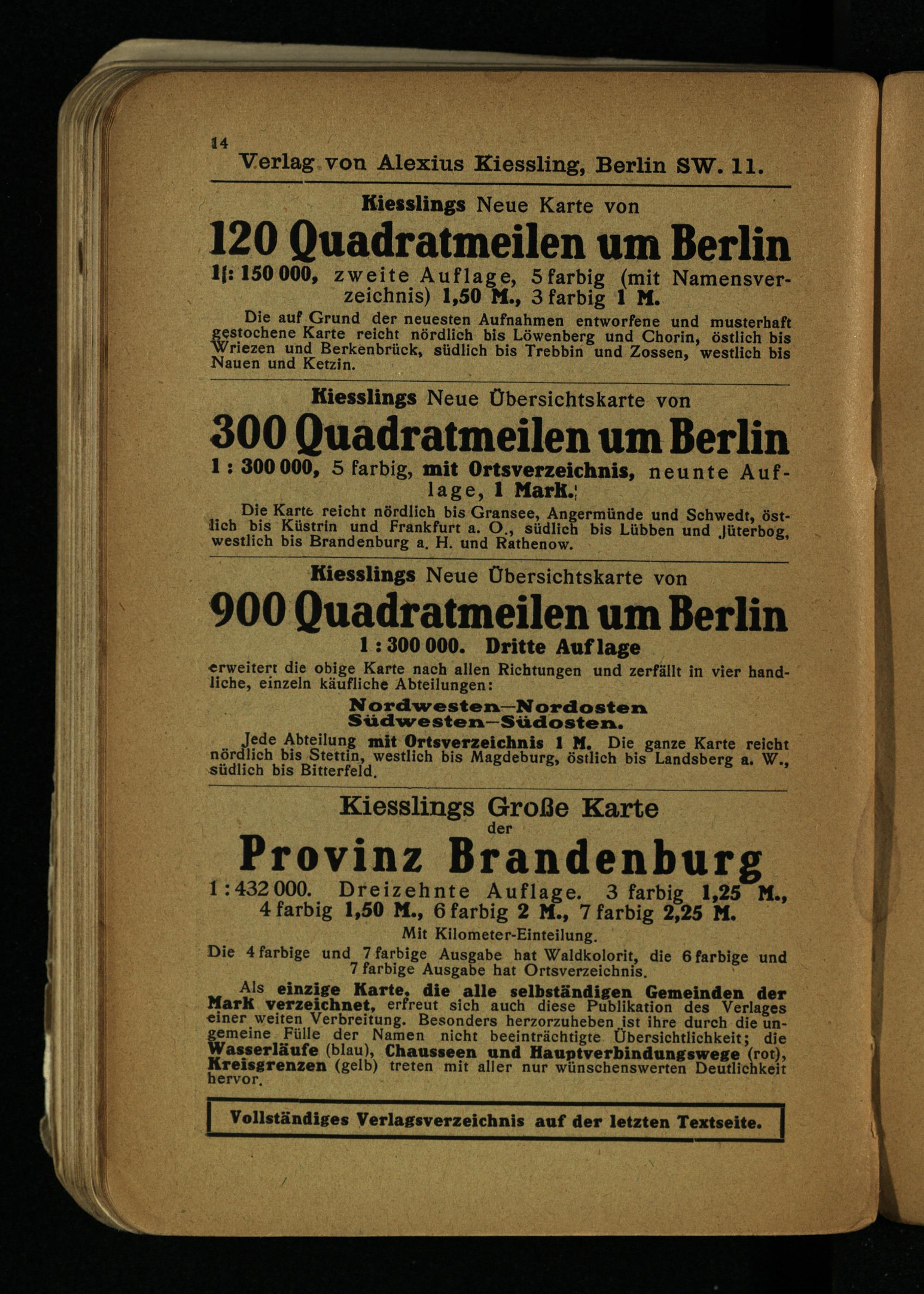 Als einzige Karte« die alle selbständigen Gemeinden der Mark verzeichnet, erfreut sich auch diese Publikation des Verlages einer weiten Verbreitung. Besonders herzorzuheben ist ihre durch die un- gemeine Fülle der Namen nicht beeinträchtigte Übersichtlichkeit; die Wasserläufe (blau), Chausseen und Hauptverbindungswege (rot), Kreisgrenzen (gelb) treten mit aller nur wünschenswerten Deutlichkeit hervor.