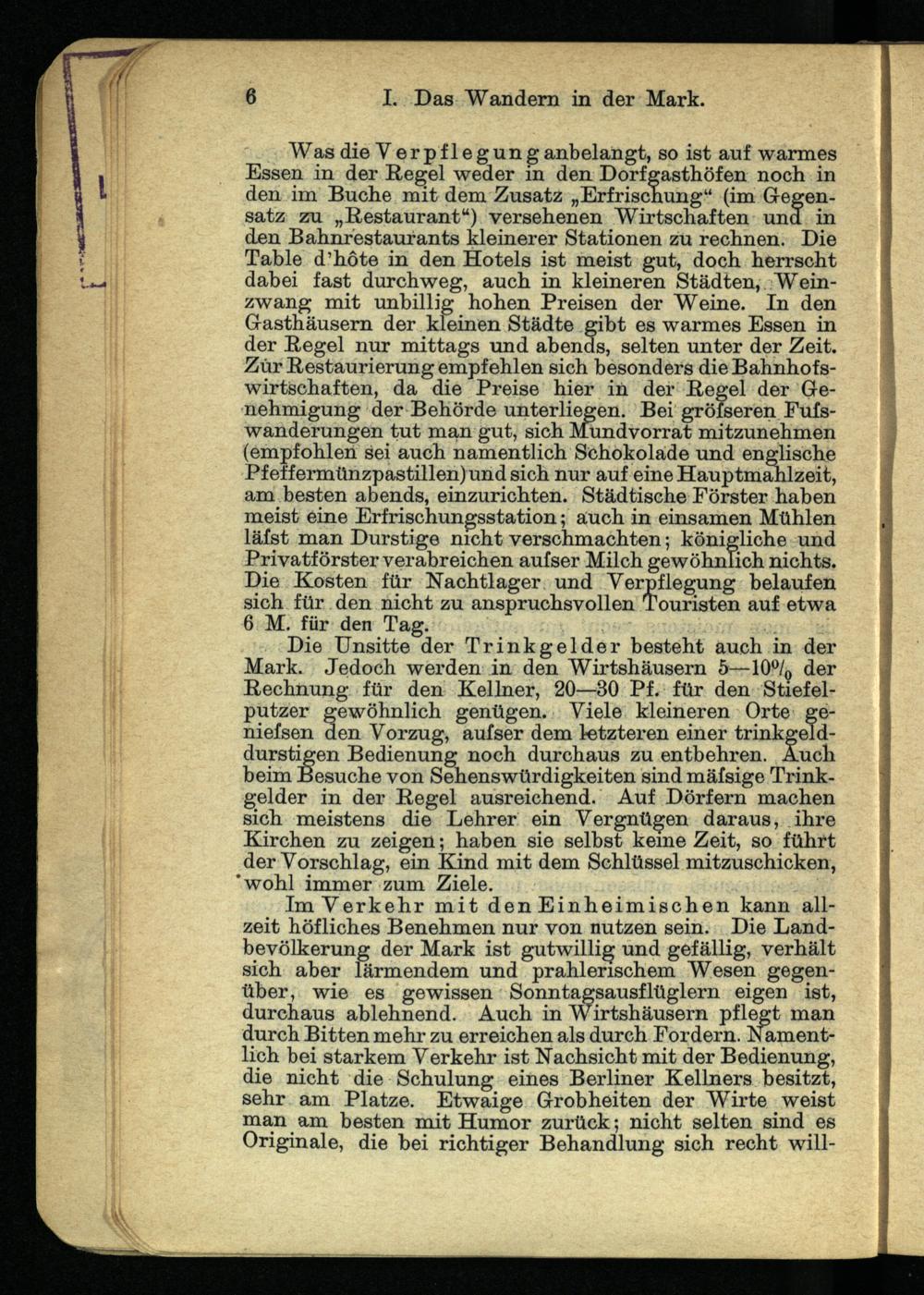Was die Verpflegung anbelangt, so ist auf warmes Essen in der Regel weder in den Dorfgasthöfen noch in den im Buche mit dem Zusatz „Erfrischung“ (im Gegensatz zu „Restaurant“) versehenen Wirtschaften und in den Bahnrestaurants kleinerer Stationen zu rechnen. Die Table d’höte in den Hotels ist meist gut, doch herrscht dabei fast durchweg, auch in kleineren Städten, Weinzwang mit unbillig hohen Preisen der Weine. In den Gasthäusern der kleinen Städte gibt es warmes Essen in der Regel nur mittags und abends, selten unter der Zeit. Zur Restaurierung empfehlen sich besonders die Bahnhofswirtschaften, da die Preise hier in der Regel der Genehmigung der Behörde unterliegen. Bei grölseren Fufs- wanderungen tut man gut, sich Mundvorrat mitzunehmen (empfohlen sei auch namentlich Schokolade und englische Pfeffermünzpastillen) und sich nur auf eine Hauptmahlzeit, am besten abends, einzurichten. Städtische Förster haben meist eine Erfrischungsstation; auch in einsamen Mühlen lässt man Durstige nicht verschmachten; königliche und Privatförster verabreichen aufser Milch gewöhnlich nichts. Die Kosten für Nachtlager und Verpflegung belaufen sich für den nicht zu anspruchsvollen Touristen auf etwa 6 M. für den Tag.