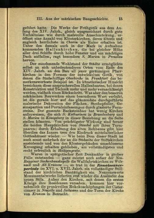 geführt hatte. Die Werke der Frühgotik aus dem Anfang des XIV. Jahrh., gleich ausgezeichnet durch gute Verhältnisse wie durch mafsvolle Ausschmückung, eröffnet eine Anzahl von Klosterkirchen, deren älteste und zugleich herrlichste in Chorin als Ruine erhalten ist. Unter den damals auch in der Mark in Aufnahme kommenden Hallenkirchen, die bei gleicher Höhe aller drei Schiffe durch hohe Fenster und ein mächtiges Dach auffallen, ragt besonders u S. Marien in Prenzla hervor.