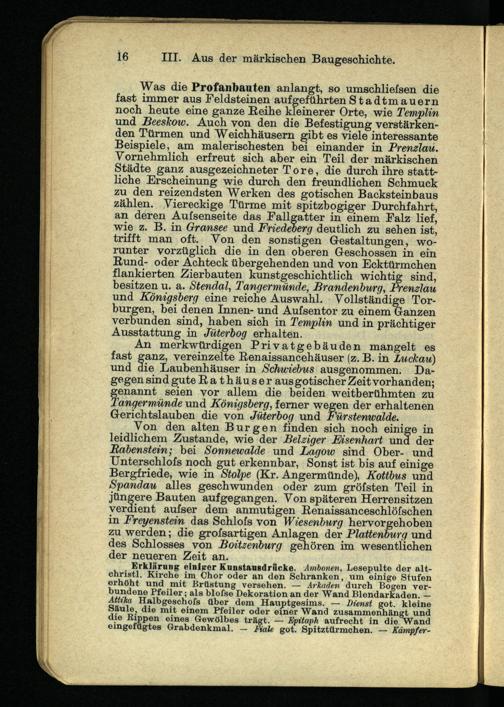 Was die Profanbauten anlangt, so umschliessen die fast immer aus Feldsteinen auf geführten Stadtmauern noch heute eine ganze Reihe kleinerer Orte, wie Templin und Beeskow. Auch von den die Befestigung verstärkenden Türmen und Weichhäusern gibt es viele interessante Beispiele, am malerischesten bei einander in Prenzlau. Vornehmlich erfreut sich aber ein Teil der märkischen Städte ganz ausgezeichneter Tore, die durch ihre stattliche Erscheinung wie durch den freundlichen Schmuck zu den reizendsten Werken des gotischen Backsteinbaus zählen. Viereckige Türme mit spitzbogiger Durchfahrt, an deren Aufsenseite das Fallgatter in einem Falz lief, wie z. B. in , Gransee und Friedeber g deutlich zu sehen ist trifft man oft. Von den sonstigen Gestaltungen, worunter vorzüglich die in den oberen Geschossen in ein Rund- oder Achteck übergehenden und von Eckttirmchen flankierten Zierbauten kunstgeschichtlich wichtig sind, besitzen u. a. Stendal, Tangermünde, Brandenburg, Prenzlau und Königsberg eine reiche Auswahl. Vollständige Torburgen, bei denen Innen- und Aufsentor zu einem Ganzen verbunden sind, haben sich in Templin und in prächtiger Ausstattung in Jüterbog erhalten.