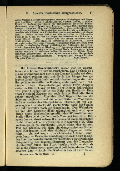 Bei älteren Bauernhäusern lassen sich im wesentlichen drei Grundformen unterscheiden. Das sächsische Haus ist unverändert nur in der Lenzer Wische erhalten. Vom Giebel gelangt man auf die in der Längsachse gelegene Diele (Hausflur); seitlich davon liegen die nach ihr geöffneten Ställe, im Hintergründe hinter dem Herdraume Stuben. Umgestaltungen dieser Form (Zimmer statt der Ställe, Gang an Stelle der Diele u. dgl.) reichen von jener Gegend bis in die Nähe von Berlin. — Dem fränkischen Hause ist auch in der Mark die Herrschaft zugefallen. Um den Hof liegen: hinten die Scheune, nach vorn auf der einen Seite das Wohnhaus, auf der andern das Stallgebäude, letzteres oft mit vorgekragtem Oberstock; die vierte Seite, nach der Strafse zu, hat bisweilen noch ein Torgebäude. Das Wohnhaus ist von der Langseite (Hof) zugänglich-und wird quer durch einen Küchenflur geteilt, der Wohnräume und Ställe (diese jetzt vielfach auch Zimmer) trennt. — Beispiele des ostdeutschen Hauses sind am zahlreichsten in der Neumark anzutreffen, so in Zäckerick a O. Eine geräumige (z. T. zugebaute) Laube bildet den unteren Teil des Giebels, aus dem ein Gang zwischen Stuben zum Herdraume und den dahinter liegenden Ställen führt, — ein Anklang an die sächsische Art der Raumverteilung. — Das stets einstöckige wendische Haus, das über die Lausitz hinaus verbreitet ist, zeigt fränkische Gruppierung der Räume (Eingang von der Langseite, Querteilung durch den Flur). Aufsen stellt es sich als ein nicht selten recht geschmackvoll behandelter Blockhausbau dar. — Auch die Kolonistenhäuser Fried- Wanderbuch für die Mark. 11. 2