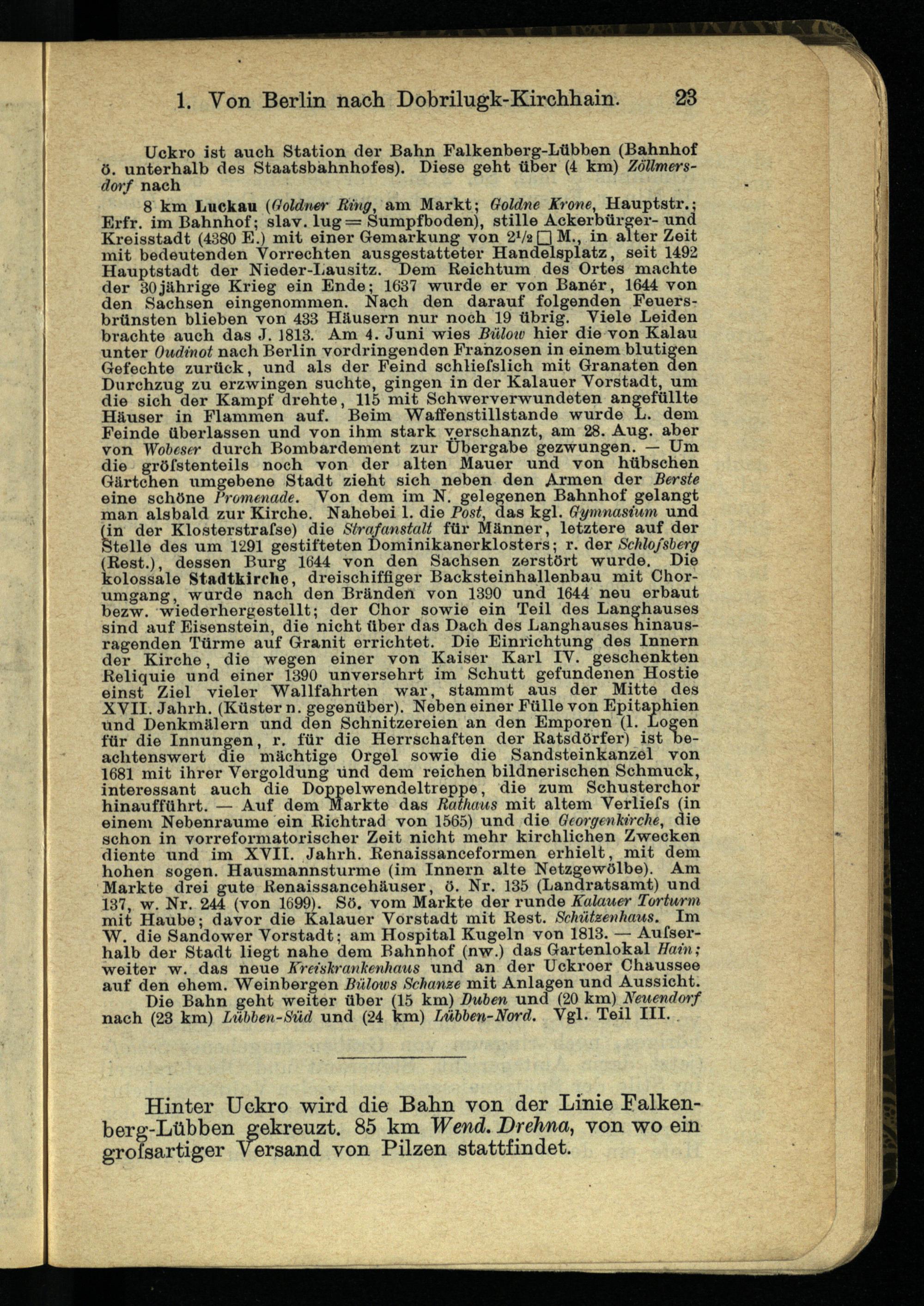 8 km Luckau ( Goldner Ring , am Markt; Goldne Krone , Hauptstr,; Erfr. im Bahnhof; slav. lug = Sumpfboden), stille Ackerbürger-und Kreisstadt (4380 E.) mit einer Gemarkung von 2V*QM., in alter Zeit mit bedeutenden Vorrechten ausgestatteter Handelsplatz, seit 1492 Hauptstadt der Nieder-Lausitz. Dem Reichtum des Ortes machte der 30jährige Krieg ein Ende; 1637 wurde er von Banér, 1644 von den Sachsen eingenommen. Nach den darauf folgenden Feuersbrünsten blieben von 433 Häusern nur noch 19 übrig. Viele Leiden brachte auch das J. 1813. Am 4. Juni wies Büloiv hier die von Kalau unter Oudinot nach Berlin vordringenden Franzosen in einem blutigen Gefechte zurück, und als der Feind schliesslich mit Granaten den Durchzug zu erzwingen suchte, gingen in der Kalauer Vorstadt, um die sich der Kampf drehte, 115 mit Schwerverwundeten angefüllte Häuser in Flammen auf. Beim Waffenstillstände wurde L. dem Feinde überlassen und von ihm stark verschanzt, am 28. Aug. aber von Wobeser durch Bombardement zur Übergabe gezwungen. — Um die grösstenteils noch von der alten Mauer und von hübschen Gärtchen umgebene Stadt zieht sich neben den Armen der Berste eine schöne Promenade. Von dem im N. gelegenen Bahnhof gelangt man alsbald zur Kirche. Nahebei 1. die Post , das kgl. Gymnasium und (in der Klosterstrasse) die Strafanstalt für Männer, letztere auf der Stelle des um 1291 gestifteten Dominikanerklosters; r. der Schlossberg (Rest.), dessen Burg 1644 von den Sachsen zerstört wurde. Die kolossale Stadtkirche, dreischiffiger Backsteinhallenbau mit Chorumgang, wurde nach den Bränden von 1390 und 1644 neu erbaut bezw. wiederhergestellt; der Chor sowie ein Teil des Langhauses sind auf Eisenstein, die nicht über das Dach des Langhauses hinausragenden Türme auf Granit errichtet. Die Einrichtung des Innern der Kirche, die wegen einer von Kaiser Karl IV. geschenkten Reliquie und einer 1390 unversehrt im Schutt gefundenen Hostie einst Ziel vieler Wallfahrten war, stammt aus der Mitte des XVII. Jahrh. (Küster n. gegenüber). Neben einer Fülle von Epitaphien und Denkmälern und den Schnitzereien an den Emporen (1. Logen für die Innungen, r. für die Herrschaften der Ratsdörfer) ist Beachtenswert die mächtige Orgel sowie die Sandsteinkanzel von 1681 mit ihrer Vergoldung und dem reichen bildnerischen Schmuck, interessant auch die Doppelwendeltreppe, die zum Schusterchor hinaufführt. — Auf dem Markte das Rathaus mit altem Verliess (in einem Nebenraume ein Richtrad von 1565) und die Georgenkirche, die schon in vorrefoxmiatorischer Zeit nicht mehr kirchlichen Zwecken diente und im XVII. Jahrh. Renaissanceformen erhielt, mit dem hohen sogen. Hausmannsturme (im Innern alte Netzgewölbe). Am Markte drei gute Renaissancehäuser, ö. Nr. 135 (Landratsamt) und 137, w. Nr. 244 (von 1699). Sö. vom Markte der runde Kalauer Torturm mit Haube; davor die Kalauer Vorstadt mit Rest. Schützenhaus. Im W. die Sandower Vorstadt; am Hospital Kugeln von 1813. — Aufser- halb der Stadt liegt nahe dem Bahnhof (nw.) das Gartenlokal Hain; weiter w. das neue Kreiskrankenhaus und an der Uckroer Chaussee auf den ehern. Weinbergen Bülows Schanze mit Anlagen und Aussicht.