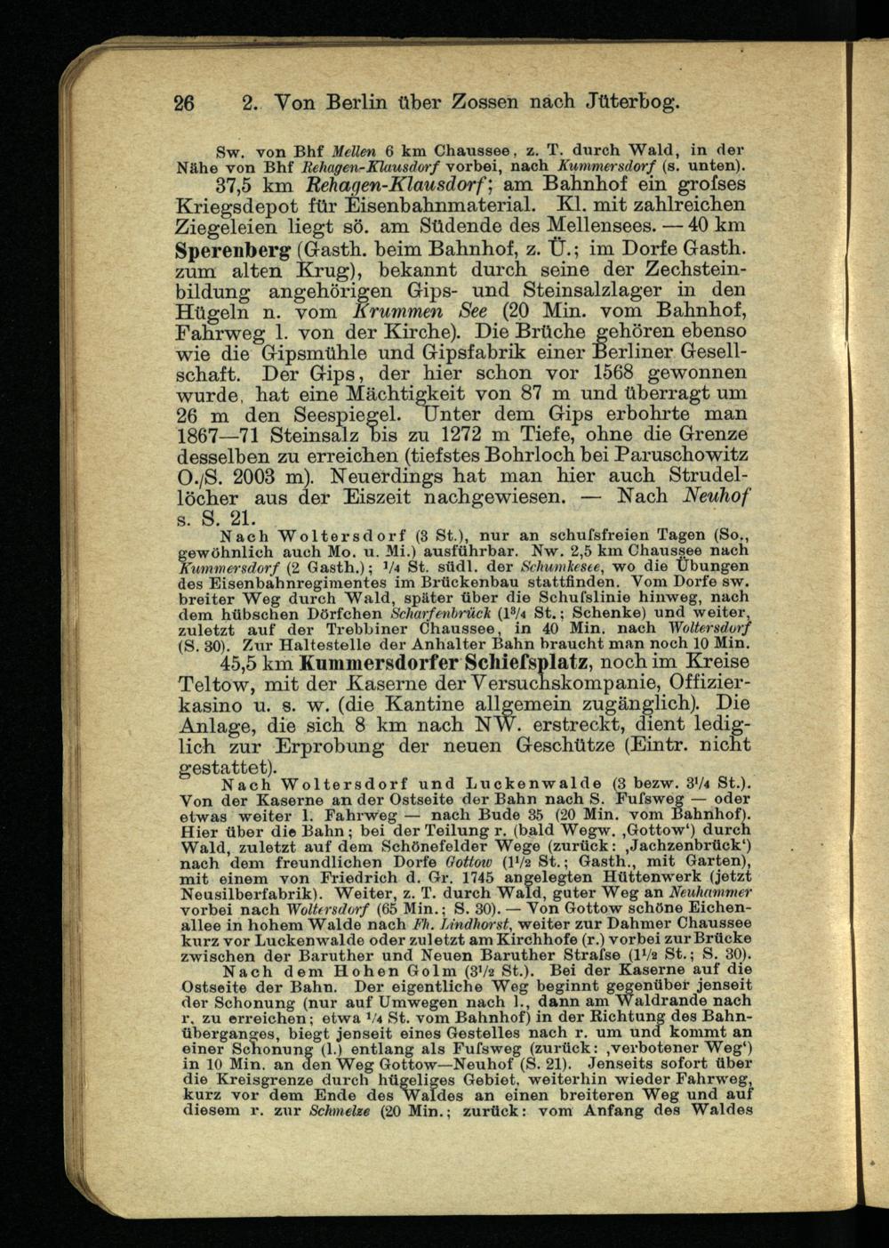 37.5 km Rehagen-Klausdorf; am Bahnhof ein grosses Kriegsdepot für Eisenbahnmaterial. Kl. mit zahlreichen Ziegeleien liegt sö. am Südende des Mellensees. — 40 km Sperenberg (Gasth. beim Bahnhof, z. Ü.; im Dorfe Gasth. zum alten Krug), bekannt durch seine der Zechstein- bildung angehörigen Gips- und Steinsalzlager in den Hügeln n. vom Krummen See (20 Min. vom Bahnhof, Fahrweg 1. von der Kirche). Die Brüche gehören ebenso wie die Gipsmühle und Gipsfabrik einer Berliner Gesellschaft. Der Gips, der hier schon vor 1568 gewonnen wurde, hat eine Mächtigkeit von 87 m und überragt um 26 m den Seespiegel. Unter dem Gips erbohrte man 1867—71 Steinsalz bis zu 1272 m Tiefe, ohne die Grenze desselben zu erreichen (tiefstes Bohrloch bei Paruschowitz O./S. 2003 m). Neuerdings hat man hier auch Strudellöcher aus der Eiszeit nachgewiesen. — Nach Neuhof s. S. 21.