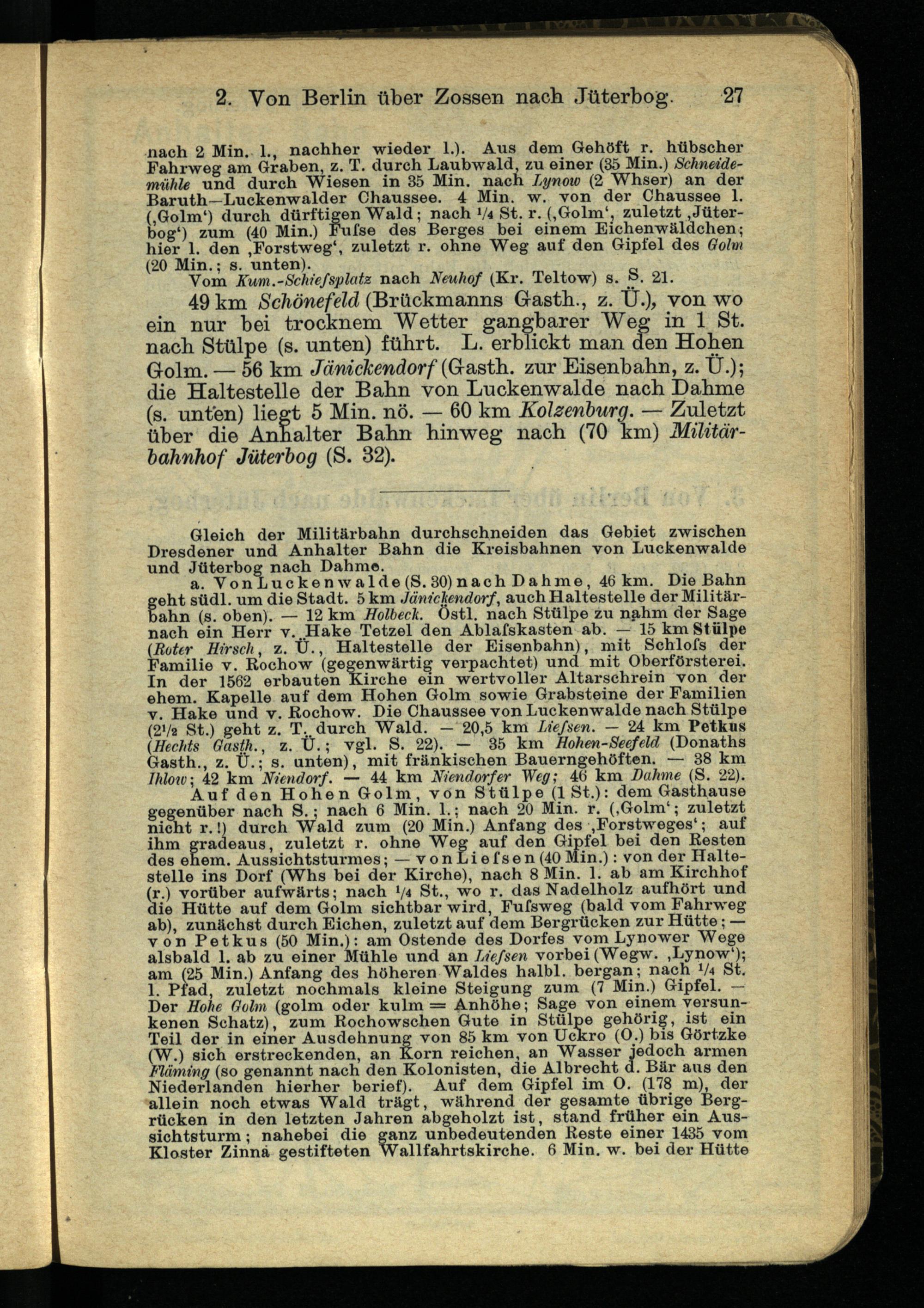 49 km Schönefeld (Brückmanns Gasth., z. t}.), von wo ein nur bei trocknem Wetter gangbarer Weg in 1 St. nach Stülpe (s. unten) führt. L. erblickt man den Hohen Golm. — 56 km Jänickendorf (Gasth. zur Eisenbahn, z. Ü.); die Haltestelle der Bahn von Luckenwalde nach Dahme (s. unten) liegt 5 Min. nö. — 60 km Kolzenburg. — Zuletzt über die Anhalter Bahn hinweg nach (70 km) Militärhahnhof Jüterbog (S. 32).