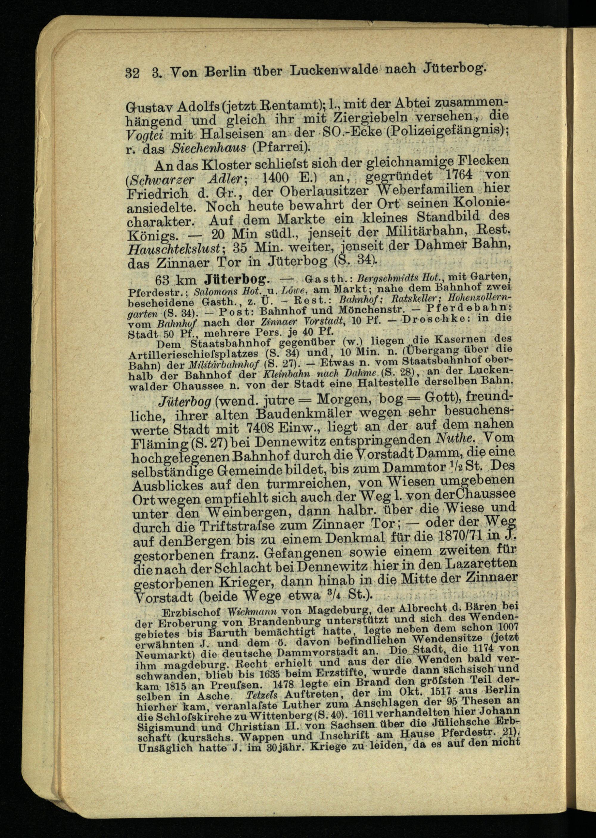 63 km Jüterbog. — Ga sth .: Bergschmidts Hot., mit Garten, Pferdestr.; Solomons Hot. u. Löwe, am Markt; nahe dem Bahnhof zwei bescheidene Gasth., z. Ü. — Rest.: Bahnhof; Ratskeller; Hohenzollern- garten (S. 34). — Post: Bahnhof und Mönchenstr. — Pferdebahn: vom Bahnhof nach der Zinnaer Vorstadt , 10 Pf. —Droschke: in die Stadt 50 Pf., mehrere Pers. je 40 Pf.