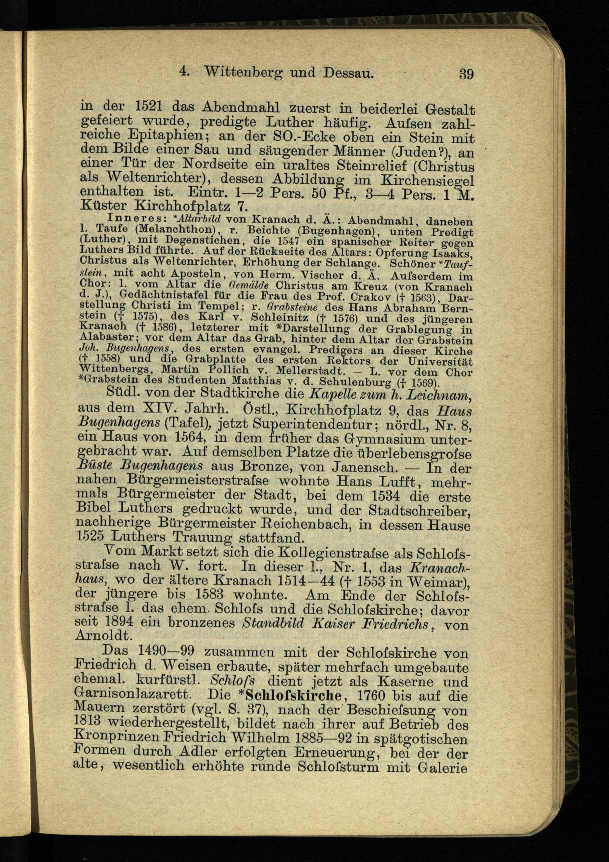 in der 1521 das Abendmahl zuerst in beiderlei Gestalt gefeiert wurde, predigte Luther häufig. Aussen zahlreiche Epitaphien; an der SO.-Ecke oben ein Stein mit dem Bilde einer Sau und säugender Männer (Juden?), an einer Tür der Nordseite ein uraltes Steinrelief (Christus als Weltenrichter), dessen Abbildung im Kirchensiegel enthalten ist. Eintr. 1—2 Pers. 50 Pf., 3—4 Pers. 1 M. Küster Kirchhofplatz 7.