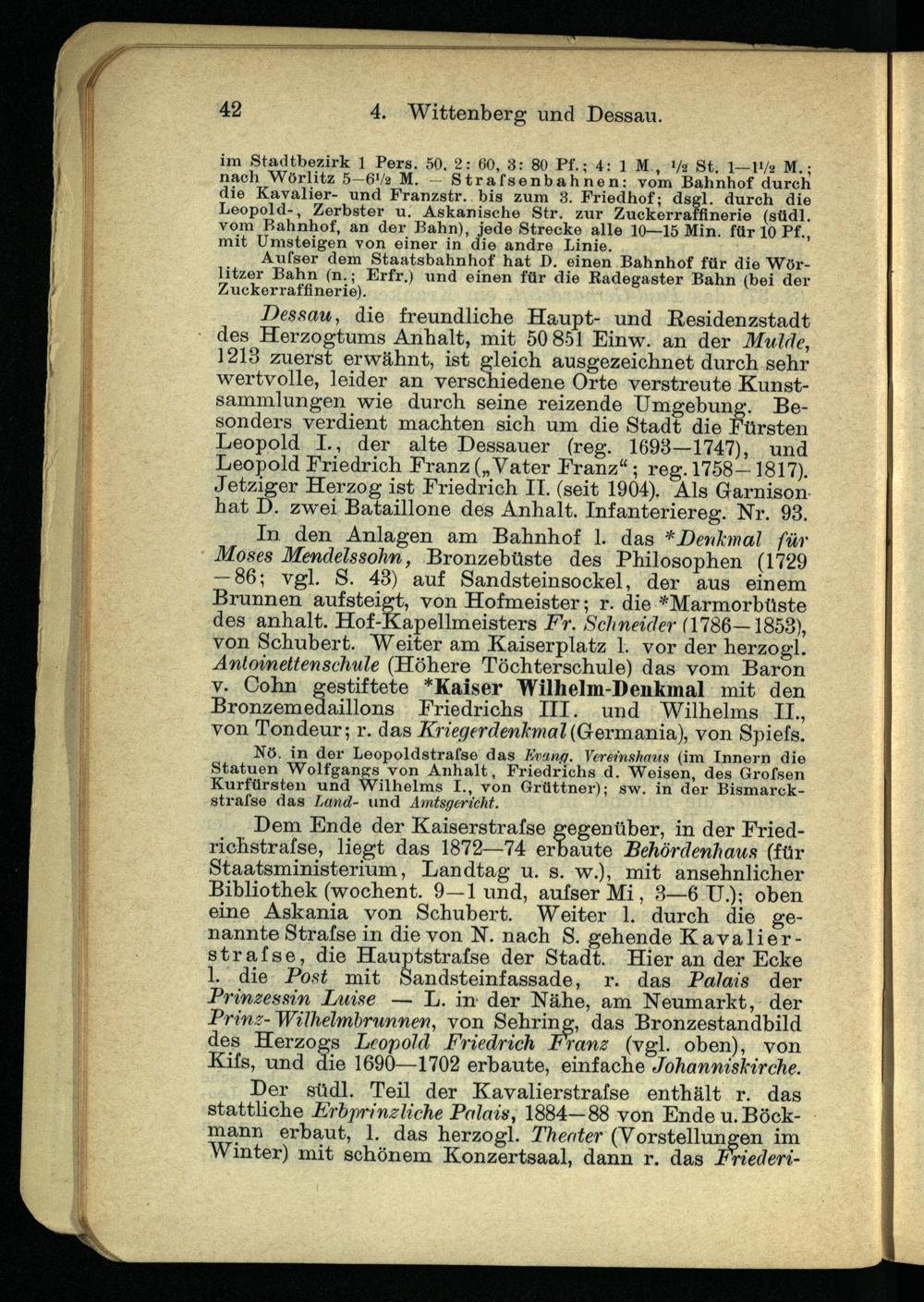 In den Anlagen am Bahnhof 1. das *Denkmal für Moses Mendelssohn, Bronzebüste des Philosophen (1729 — 86; vgl. S. 43) auf Sandsteinsockel, der aus einem Brunnen aufsteigt, von Hofmeister; r. die *Marmorbüste des anhalt. Hof-Kapellmeisters Fr. Schneider (1786—1853), von Schubert. Weiter am Kaiserplatz l. vor der herzogl. Antoinettenschule (Höhere Töchterschule) das vom Baron v. Cohn gestiftete *Kaiser "Wilhelm-Denkmal mit den Bronzemedaillons Friedrichs III. und Wilhelms II., von Tondeur; r. das Kriegerdenkmal (Germania), von Spiess.