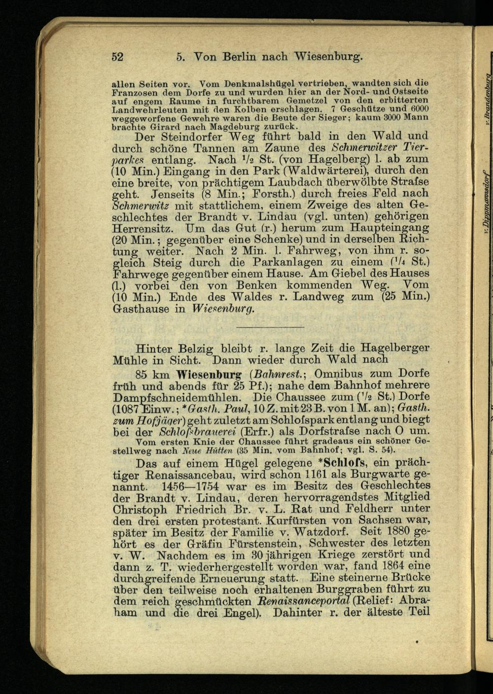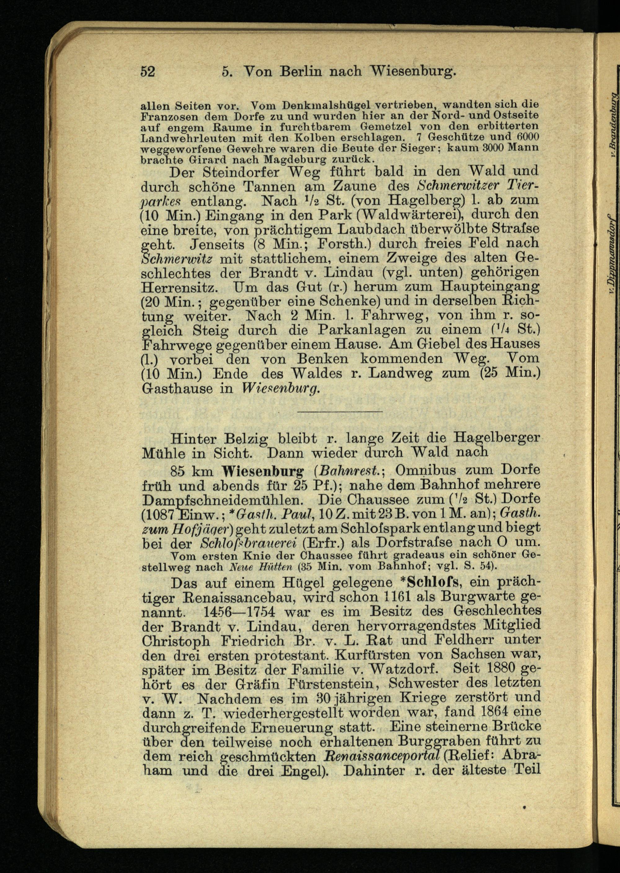 Der Steindorf er Weg führt bald in den Wald und durch schöne Tannen am Zaune des Schmerwitzer Tierparken entlang. Nach V 2 St. (von Hagelberg) 1. ab zum (10 Min.) Eingang in den Park (Waldwärterei), durch den eine breite, von prächtigem Laubdach überwölbte Strafse geht. Jenseits (8 Min.; Forsth.) durch freies Feld nach Schmermtz mit stattlichem, einem Zweige des alten Geschlechtes der Brandt v. Lindau (vgl. unten) gehörigen Herrensitz. Um das Gut fr.) herum" zum Haupteingang (20 Min.; gegenüber eine Schenke) und in derselben Richtung weiter. Nach 2 Min. 1. Fahrweg, von ihm r. so-