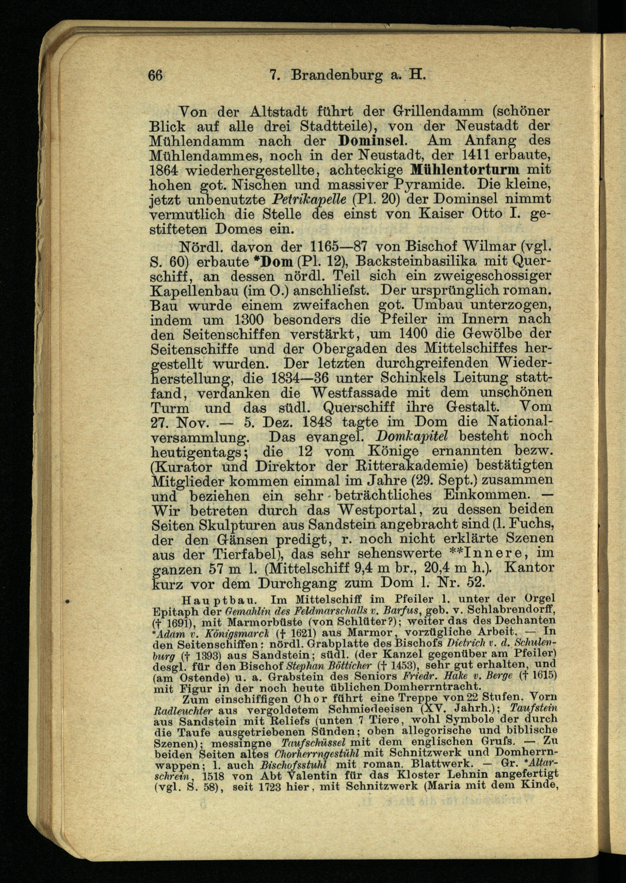 f estellt wurden. Der letzten durchgreifenden Wiedererstellung, die 1834—36 unter Schinkels Leitung stattfand, verdanken die Westfassade mit dem unschönen Turm und das südl. Querschiff ihre Gestalt. Vom 27. Nov. — 5. Dez. 1848 tagte im Dom die Nationalversammlung. Das evangel. Domkapitel besteht noch heutigentags; die 12 vom Könige ernannten bezw. (Kurator und Direktor der Ritterakademie) bestätigten Mitglieder kommen einmal im Jahre (29. Sept.) zusammen und beziehen ein sehr - beträchtliches Einkommen. — Wir betreten durch das Westportal, zu dessen beiden Seiten Skulpturen aus Sandstein angebracht sind (1. Fuchs, der den Gänsen predigt, r. noch nicht erklärte Szenen aus der Tierfabel), das sehr sehenswerte **Innere, im