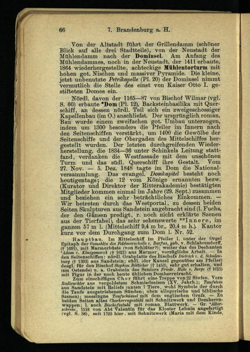 Von der Altstadt führt der Grillendamm (schöner Blick auf alle drei Stadtteile), von der Neustadt der Mühlendamm nach der Dominsel. Am Anfang des Mühlendammes, noch in der Neustadt, der 1411 erbaute, 1864 wiederhergestellte, achteckige Mühlentorturm m it hohen got. Nischen und massiver Pyramide. Die kleine, jetzt unbenutzte Petrikapelle (PI. 20) der Dominsel nimmt vermutlich die Stelle des einst von Kaiser Otto I. gestifteten Domes ein.