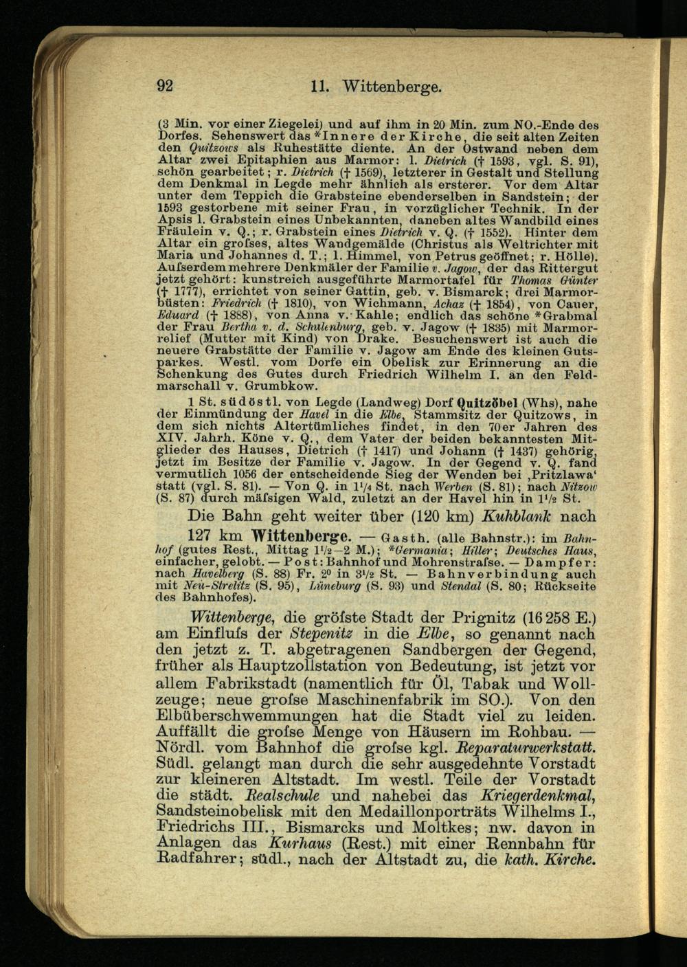 1 St. südöstl. von Legde (Landweg) Dorf Quitzöbel (Whs), nahe der Einmündung der Havel in die Elbe, Stammsitz der Quitzows, in dem sich nichts Altertümliches findet, in den 70er Jahren des XIY. Jahrh. Köne v. Q., dem Vater der beiden bekanntesten Mitglieder des Hauses, Dietrich (f 1417) und Johann (+ 1437) gehörig, jetzt im Besitze der Familie v. Jagow. In der Gegend v. Q. fand vermutlich 1056 der entscheidende Sieg der Wenden bei ,Pritzlawa‘ statt (vgl. S. 81). — Von Q. in V/a St. nach Werben (S. 81); nach Nitzow (S. 87) durch mäfsigen Wald, zuletzt an der Havel hin in IV2 St.