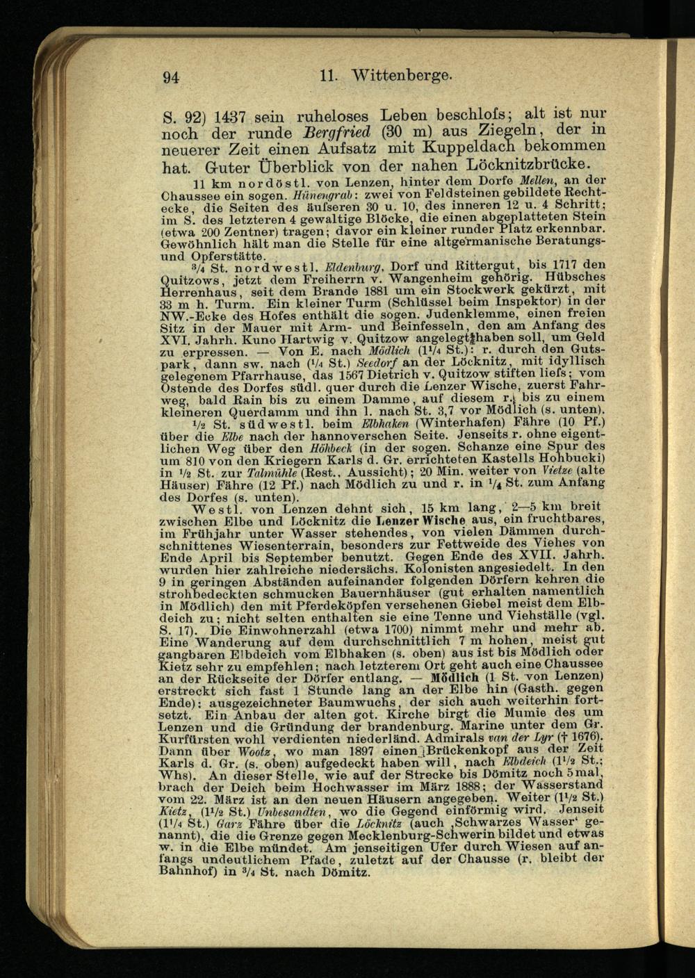 Westl. von Lenzen dehnt sich, 15 km lang, 2—5 km breit zwischen Elbe und Löcknitz die Lenzer Wische aus, ein fruchtbares, im Frühjahr unter Wasser stehendes, von vielen Dämmen durchschnittenes Wiesenterrain, besonders zur Fettweide des Viehes von Ende April bis September benutzt. Gegen Ende des XVII. Jahrh. wurden hier zahlreiche niedersächs. Kolonisten angesiedelt. In den 9 in geringen Abständen aufeinander folgenden Dörfern kehren die strohbedeckten schmucken Baueimhäuser (gut erhalten namentlich in Mödlich) den mit Pferdeköpfen versehenen Giebel meist dem Elbdeich zu; nicht selten enthalten sie eine Tenne und Viehställe (vgl. S. 17). Die Einwohnerzahl (etwa 1700) nimmt mehr und mehr ab. Eine Wanderung auf dem durchschnittlich 7 m hohen, meist gut gangbaren Elbdeich vom Elbhaken (s. oben) aus ist bis Mödlich oder Kietz sehr zu empfehlen; nach letzterem Ort geht auch eine Chaussee an der Rückseite der Dörfer entlang. — Mödlich (1 St. von Lenzen) erstreckt sich fast 1 Stunde lang an der Elbe hin (Gasth. gegen Ende); ausgezeichneter Baumwuchs, der sich auch weiterhin fortsetzt. Ein Anbau der alten got. Kirche birgt die Mumie des um Lenzen und die Gründung der brandenburg. Marine unter dem Gr. Kurfürsten wohl verdienten niederland. Admirals van der Lyr (f 1676). Dann über Wootz , wo man 1897 einen Brückenkopf aus der Zeit Karls d. Gr. (s. oben) aufgedeckt haben will, nach Elbdeich (IVa St.: Whs). An dieser Stelle, wie auf der Strecke bis Dömitz noch 5mal, brach der Deich beim Hochwasser im März 1888; der Wasserstand vom 22. März ist an den neuen Häusern angegeben. Weiter (l l /a St.) Kietz, (I l /a St.) Unbesandten, wo die Gegend einförmig wird. Jenseit (F/4 St.) Garz Fähre über die Löcknitz (auch Schwarzes Wasser* genannt), die die Grenze gegen Mecklenburg-Scnwerin bildet und etwas w. in die Elbe mündet. Am jenseitigen Ufer durch Wiesen auf anfangs undeutlichem Pfade, zuletzt auf der Chausse (r. bleibt der Bahnhof) in 3 /4 St. nach Dömitz.