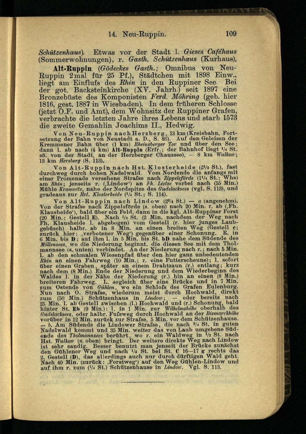 Alt-Ruppin (Gödeckes Gasth.; Omnibus von Neu- Ruppin 2mal für 25 Pf.), Städtchen mit 1898 Einw., liegt am Einflufs des Rhin in den Ruppiner See. Bei der got. Backsteinkirche (XY. Jahrh.) seit 1897 eine Bronzehüste des Komponisten Ferd. Möhring (geh. hier 1816, gest. 1887 in Wiesbaden). In dem früheren Schlosse (jetzt O.E. und Amt), dem Wohnsitz der Ruppiner Grafen, verbrachte die letzten Jahre ihres Lebens und starb 1573 die zweite Gemahlin Joachims II., Hedwig.