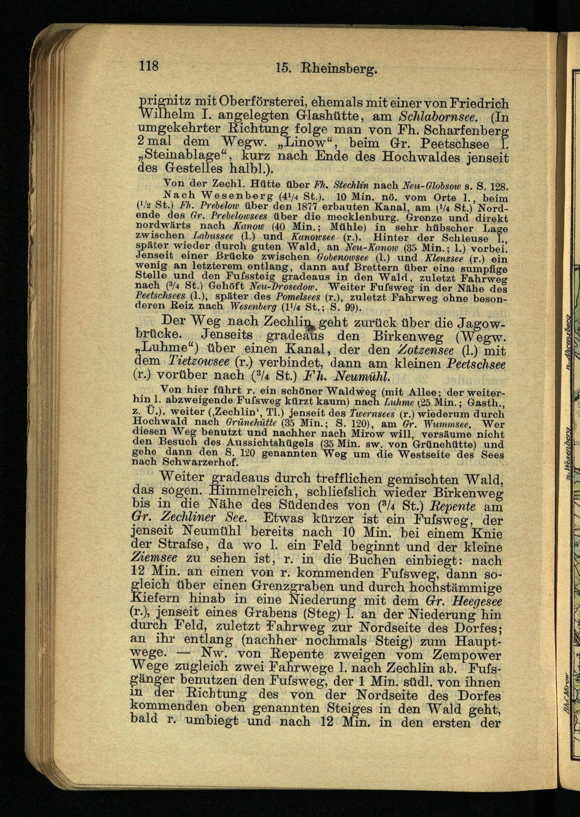 Weiter gradeaus durch trefflichen gemischten Wald, das sogen. Himmelreich, schliefslich wieder Birkenweg bis in die Nähe des Südendes von ( 3 lt St.) Repente am Gr. Zechliner Seer . Etwas kürzer ist ein Fufsweg, de jenseit Neumühl bereits nach 10 Min. hei einem Knie der Strafse, da wo 1. ein Feld beginnt und der kleine Ziemsee zu sehen ist, r. in die Buchen einbiegt: nach 12 Min. an einen von r. kommenden Fufsweg, dann sogleich über einen Grenzgraben und durch hochstämmige Kiefern hinab in eine Niederung mit dein Gr. Heegesee (r.), jenseit eines Grabens (Steg) 1. an der Niederung hin durch Feld, zuletzt Fahrweg zur Nordseite des Dorfes; an ihr entlang (nachher nochmals Steig) zum Hauptwege. — Nw. von Repente zweigen vom Zempower Wege zugleich zwei Fahrwege 1. nach Zechlin ab. Fufs- gänger benutzen den Fufsweg, der 1 Min. südl. von ihnen m der Richtung des von der Nordseite des Dorfes kommenden oben genannten Steiges in den Wald geht, bald r. umbiegt und nach 12 Min. in den ersten der