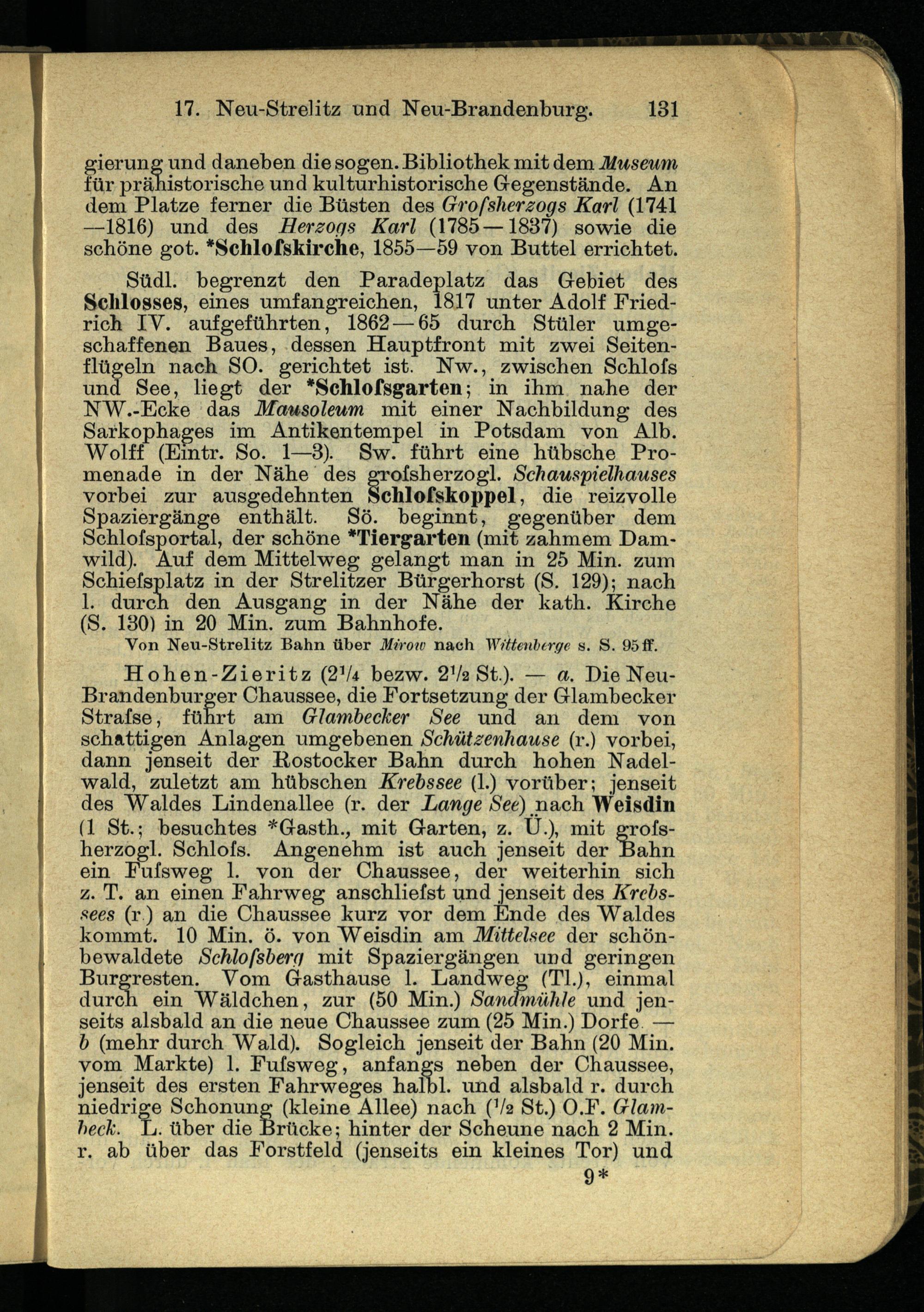 Südl. begrenzt den Paradeplatz das Gebiet des Schlosses, eines umfangreichen, 1817 unter Adolf Friedrich IV. auf geführten, 1862—65 durch Stüler umgeschaffenen Baues, dessen Hauptfront mit zwei Seitenflügeln nach SO. gerichtet ist. Nw., zwischen Schlofs und See, liegt der ‘Schlofsgarten ; in ihm nahe der NW.-Ecke das Mausoleum mit einer Nachbildung des Sarkophages im Antikentempel in Potsdam von Alb. Wolff (Emtr. So. 1—3). Sw. führt eine hübsche Promenade in der Nähe des grofsherzogl. Schauspielhauses vorbei zur ausgedehnten Schlofskoppel , die reizvolle Spaziergänge enthält. Sö. beginnt, gegenüber dem Schlofsportal, der schöne ‘Tiergarten (mit zahmem Damwild). Auf dem Mittelweg gelangt man in 25 Min. zum Schiefsplatz in der Strelitzer Bürgerhorst (S. 129); nach 1. durch den Ausgang in der Nähe der kath. Kirche (S. 130) in 20 Min. zum Bahnhofe.