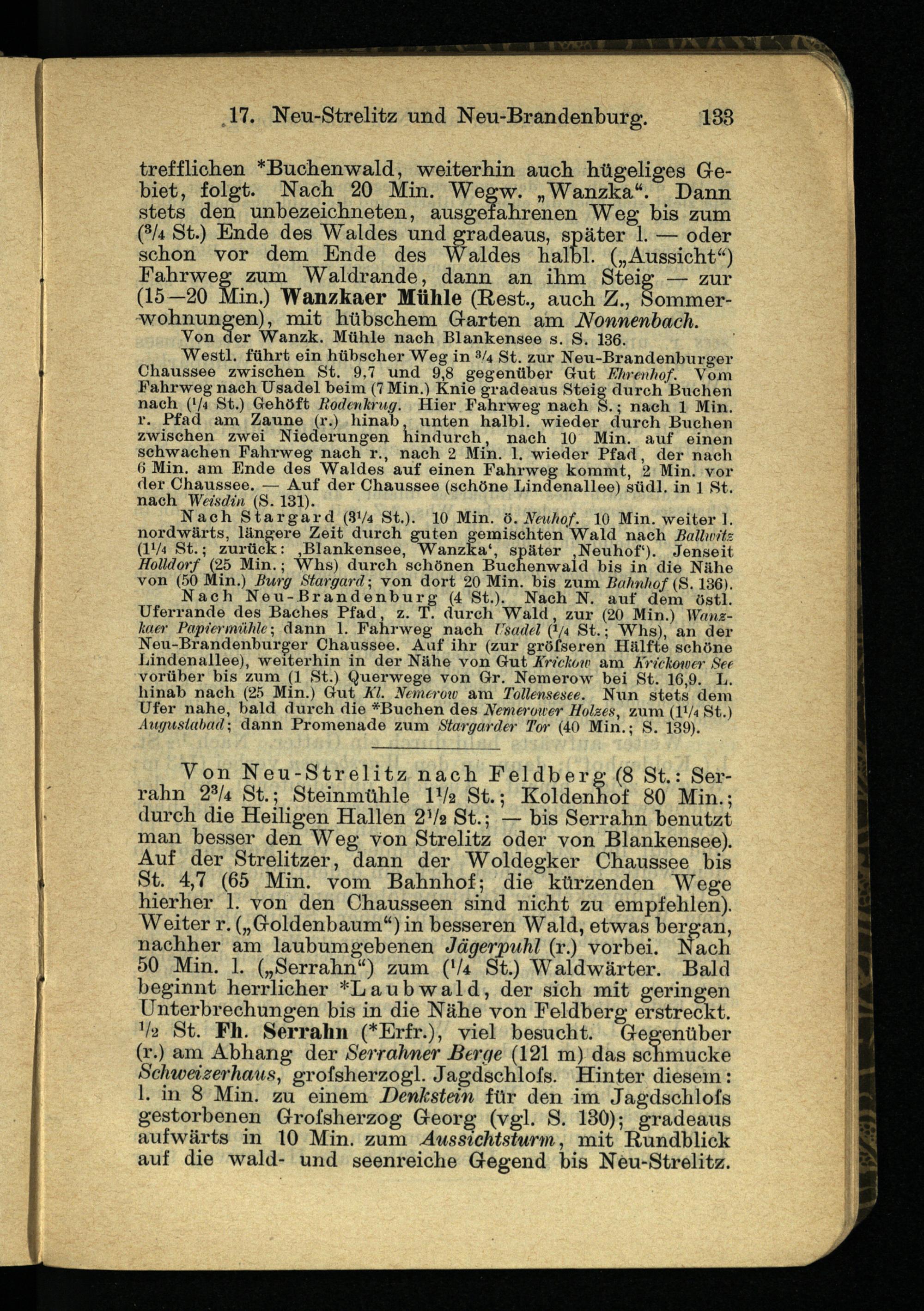 Von Neu-Strelitz nach Feldberg (8 St.: Ser- rahn 2 S U St.; Steinmühle l'/s St.; Koldenhof 80 Min.; durch die Heiligen Hallen 2Vs St.; — bis Serrahn benutzt man besser den Weg von Strelitz oder von Blankensee). Auf der Strelitzer, dann der Woldegker Chaussee bis St. 4,7 (65 Min. vom Bahnhof; die kürzenden Wege hierher 1. von den Chausseen sind nicht zu empfehlen). Weiter r. („Goldenbaum“) in besseren Wald, etwas bergan, nachher am laubumgebenen Jägerpuhl (r.) vorbei. Nach 50 Min. 1. („Serrahn“) zum ('U St.) Waldwärter. Bald beginnt herrlicher ‘Laubwald, der sich mit geringen Unterbrechungen bis in die Nähe von Feldberg erstreckt, ’/a St. Fh. Serrahn ( *Erfr.), viel besucht. Gegenüber (r.) am Abhang der Serrahner Berge (121 m) das schmucke Schweizerhaus, grofsherzogl. Jagdschloss. Hinter diesem: 1. in 8 Min. zu einem Denkstein für den im Jagdschlofs gestorbenen Grofsherzog Georg (vgl. S. 130); gradeaus aufwärts in 10 Min. zum Aussichtsturm , mit Rundblick auf die wald- und seenreiche Gegend bis Neu-Strelitz.