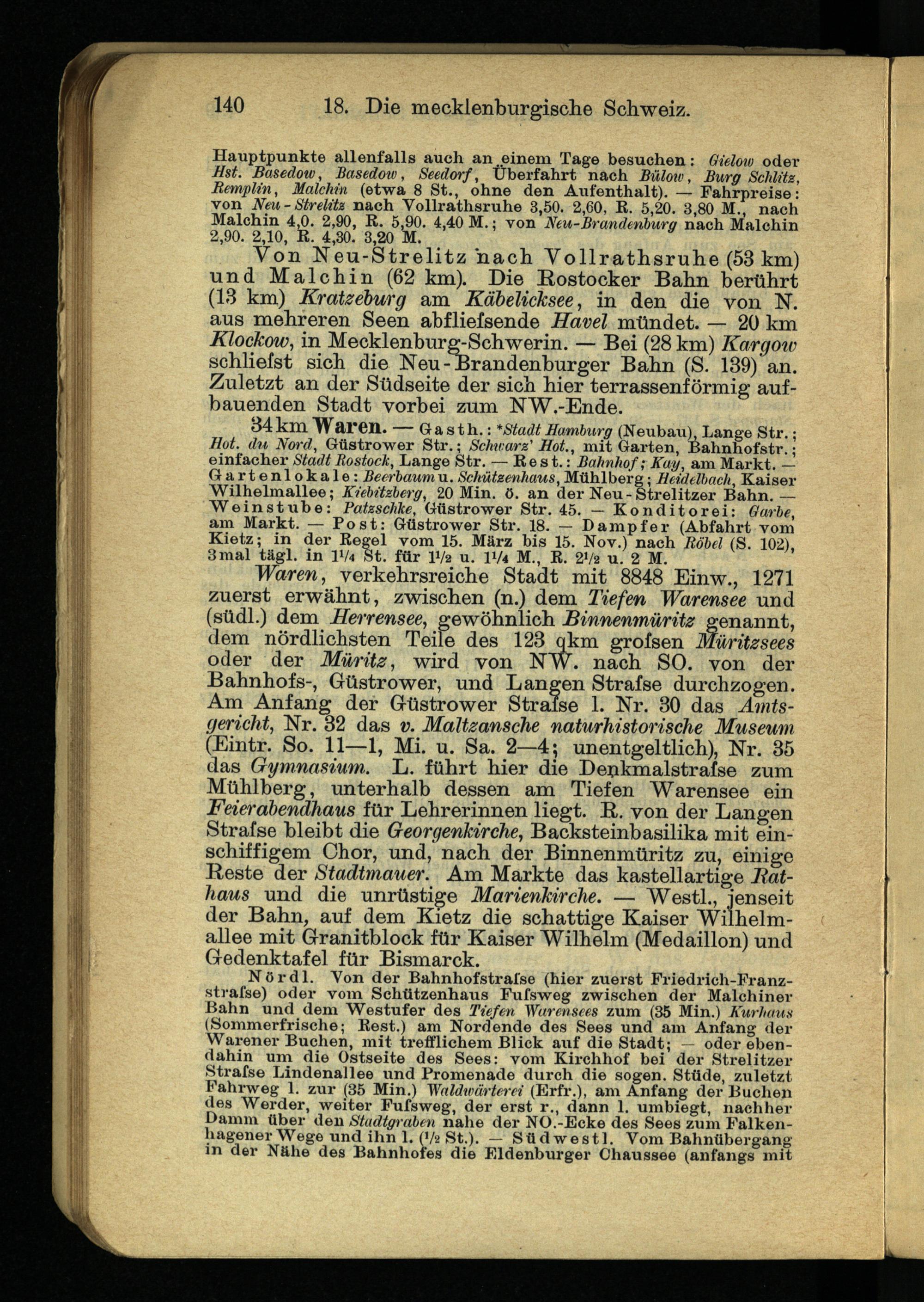 34 km Waren. — Ga st h.: * Stadt Hamburg (Neubau), Lange Str.; Hot. du Nord , Güstrower Str.; Schwarz' Hot., mit Garten, Bahnhofstr.; einfacher Stadt Rostock, Lange Str. — Re st.: Bahnhof; Kay, am Markt. — Gartenlokale: Beerbaum u. Schützenhaus, Mühlberg; Heidelbach, Kaiser Wilhelmallee; Kiebitzberg, 20 Min. ö. an der Neu-Strelitzer Bahn. — Weinstube: Patzschke, Güstrower Str. 45. — Konditorei: Garbe, am Markt. — Post: Güstrower Str. 18. — Dampfer (Abfahrt vom Kietz; in der Regel vom 15. März bis 15. Nov.) nach Röbel (S. 102), 3 mal tägl. in 1V4 St. für IV* u. 174 M., R. 27a u. 2 M.
