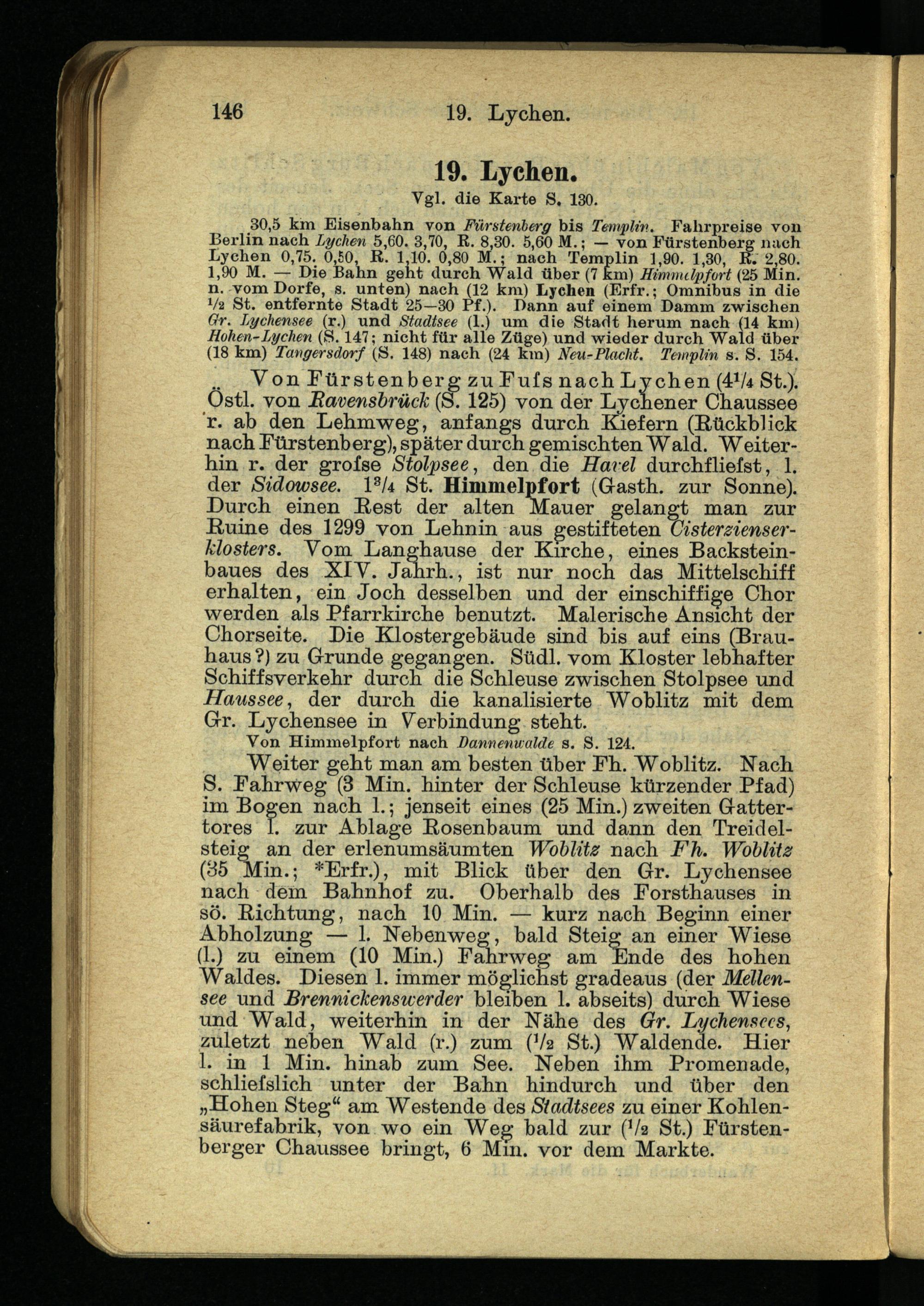 Weiter geht man am besten über Fh. Woblitz. Nach S. Fahrweg (3 Min. hinter der Schleuse kürzender Pfad) im Bogen nach 1.; jenseit eines (25 Min.) zweiten Gattertores I. zur Ablage Rosenbaum und dann den Treidelsteig an der erlenumsäumten Woblitz nach Fh. Woblitz (35 Min.; *Erfr.), mit Blick über den Gr. Lychensee nach dem Bahnhof zu. Oberhalb des Forsthauses in sö. Richtung, nach 10 Min. — kurz nach Beginn einer Ahholzung — 1. Nebenweg, bald Steig an einer Wiese (1.) zu einem (10 Min.) Fahrweg am Ende des hohen Waldes. Diesen 1. immer möglichst gradeaus (der Mellensee und Brennickenswerder bleiben 1. abseits) durch Wiese und Wald, weiterhin in der Nähe des Gr. Lychensees, zuletzt neben Wald (r.) zum (Va St.) Waldende. Hier 1. in 1 Min. hinab zum See. Neben ihm Promenade, schliefslich unter der Bahn hindurch und über den „Hohen Steg“ am Westende des Stadtsees zu einer Kohlensäurefabrik, von wo ein Weg bald zur ('/a St.) Fürstenberger Chaussee bringt, 6 Mm. vor dem Markte.
