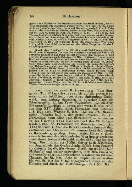 walde. Jenseits bald r. der grofse Blaussee. 18,1 km Hardenbeck; dann Allee nach Boitzenburg. — Lohnender ist der Umweg über Mahlendorf (bis Fh. Brüsenwalde 4 St.). Sö. Promenade am Zenssee (s. oben). Am (1 St.) Südende 1. über die Brücke zwischen ihm und dem Platkowsee nach Ablage und Fh. Wuppgarten (Erfr.), bereits zu Boitzenburg gehörig. Beim letzten Hause r. durch zwei Gatter und den Mahlendorfer Weg immer gradeaus, meist durch hohen Nadelwald, an den (2 St.) Gandenitzer Weg. Ihn 1. durch ein (2 Min.) Gatter nach Mahlendorf mit Jagdschlofs des Grafen Arnim (Milch beim Förster), am Ostende des Gr. Küstrinsees. Nördl. zur (20 Min.) O.F. Mahlendorf und weiter entweder n. in 25 Min. zum Krug Brüsenwalde oder nö. durch schöne Waldung zur (40 Min.) Chaussee bei St. 14,0. Sehr zu empfehlen ist weiterhin von St. 14,9 der S. 152 angegebene Umweg um den Haussee und durch den Boitzenburger Park {2 1 k St.).