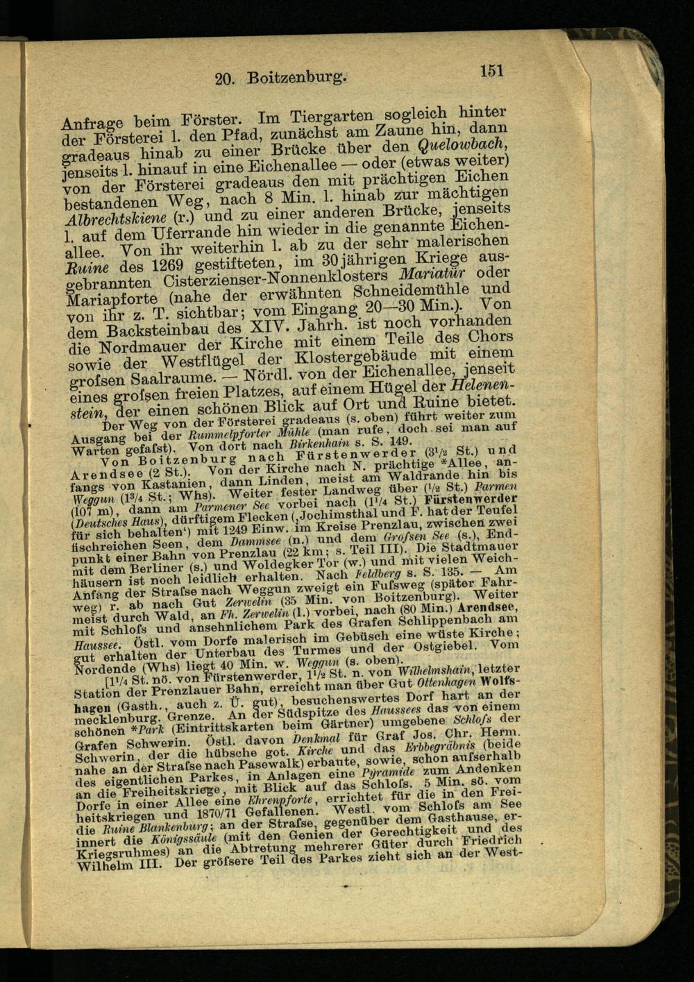 Anfrage beim Förster. Im Tiergarten sogleich hinter der Försterei 1. den Pfad, zunächst am Zaune hin, dann gradeaus hinab zu einer Brücke über den Quelowbach, jenseits 1. hinauf in eine Eichenallee — oder (etwas weiter) von der Försterei gradeaus den mit prächtigen Eichen bestandenen Weg, nach 8 Min. 1. hinab zur mächtigen Albrechtskiene (r.) und zu einer anderen Brücke, jenseits 1. auf dem Uferrande hin wieder in die genannte Eichenallee. Von ihr weiterhin 1. ab zu der sehr malerischen Buine des 1269 gestifteten, im 30jährigen Kriege ausgebrannten Cisterzienser-Nonnenklosters Mariatür oder Mariapforte (nahe der erwähnten Schneidemühle und von ihr z. T. sichtbar; vom Eingang 20—30 Min.). Von dem Backsteinbau des XIV. Jahrh. ist noch vorhanden die Nordmauer der Kirche mit einem Teile des Chors sowie der Westflügel der Klostergebäude mit einem grofsen Saalraume. — Nördl. von der Eichenallee, jenseit eines grofsen freien Platzes, auf einem Hügel der Melenen- stein, der einen schönen Blick auf Ort und Ruine bietet.