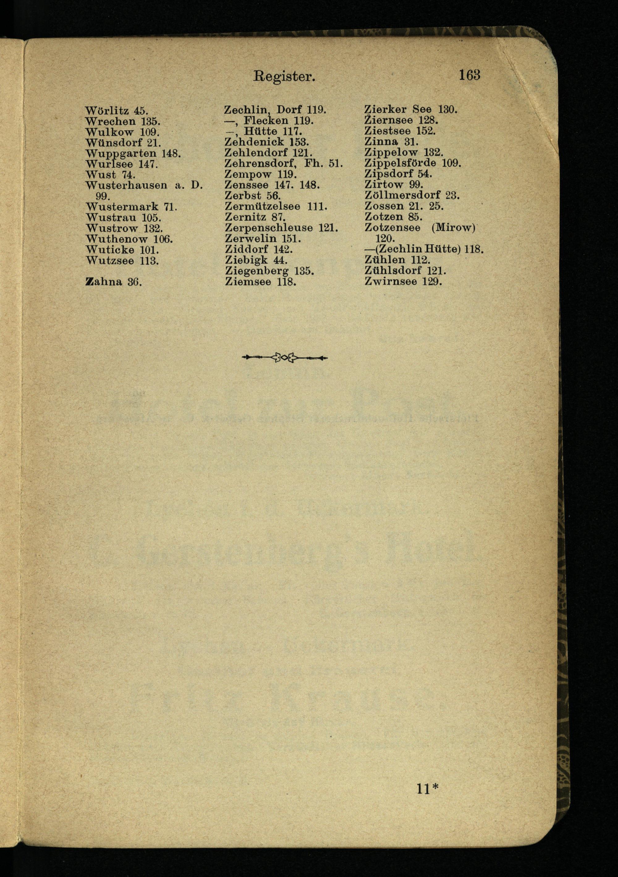 Hütte 117. Zehdenick 153. Zehlendorf 121. Zehrensdorf, Fh. 51, Zempow 119.