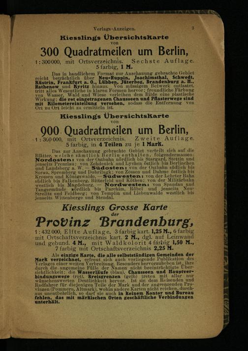 Als einzige Karte, die alle selbstständigen Gemeinden der MarK verzeichnet, erfreut sich auch vorliegende Publikation des Verlages einer weiten Verbreitung. Besonders hervorzulieben ist., ihre durch die ungemeine Fülle der Namen nicht beeinträchtigte Übersichtlichkeit: die Wasserläufe (blau), Chausseen und Hauptver- bindungswege (rot), Kreisgrenzen (gelb) treten mit aller nur wünschenswerten Deutlichkeit hervor. Ist sie dem Reisenden und Radfahrer für diejenigen Teile der Mark und der angrenzenden Provinzen (Pommeru, Altmark), wohin andere Karten nicht reichen, durchaus unentbehrlich, so darf sie auch in Keinem Kontor und Bureau fehlen, das mit märKischen Orten geschäftliche Verbindungen unterhält.