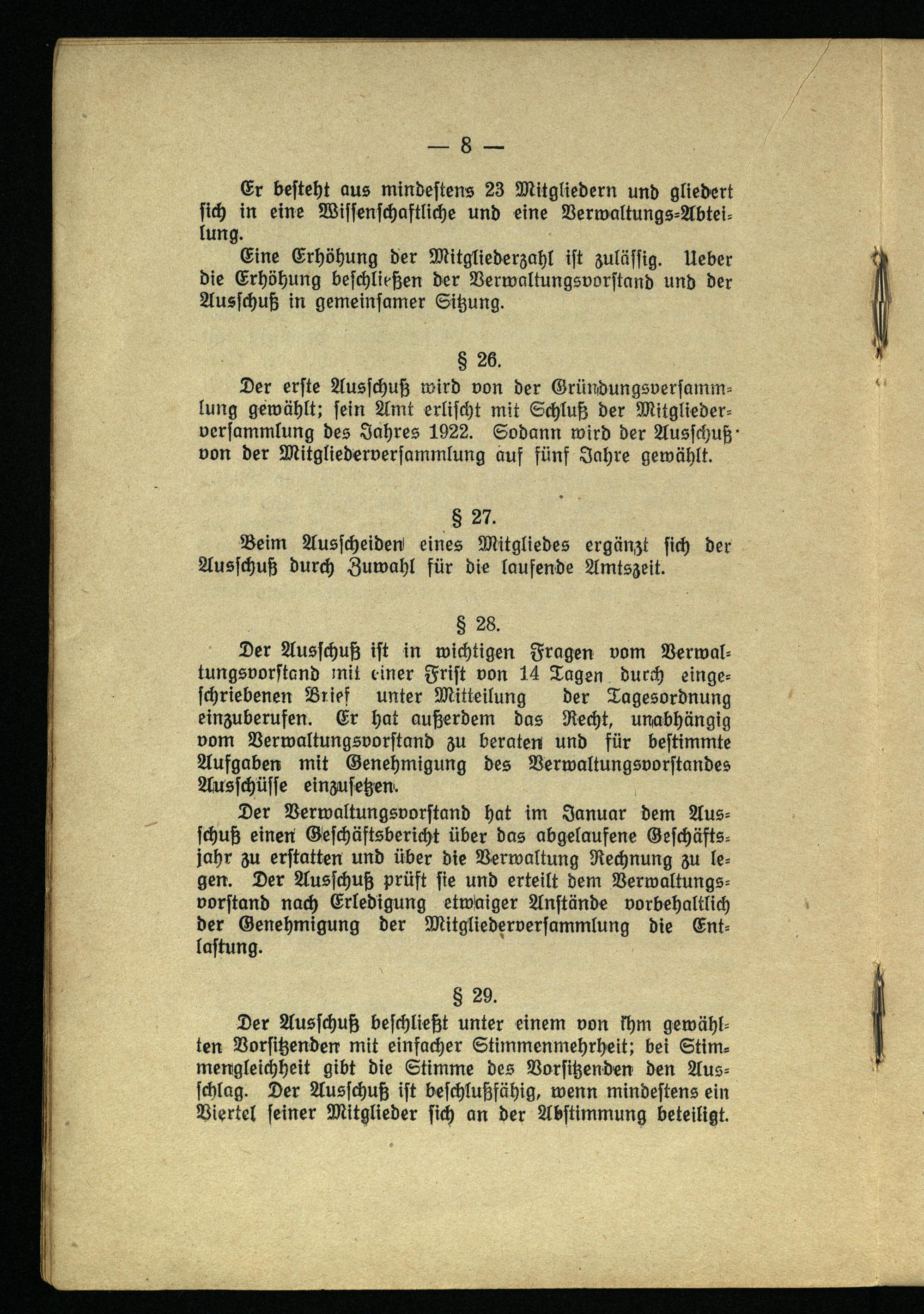 Der erste Ausschuß wird von der Grüudungsversamm- lung gewählt; sein Amt erlischt mit Schluß der Mitgliederversammlung des Jahres 1922. Sodann wird der Ausschuß von der Mitgliederversammlung auf fünf Jahre gewählt.